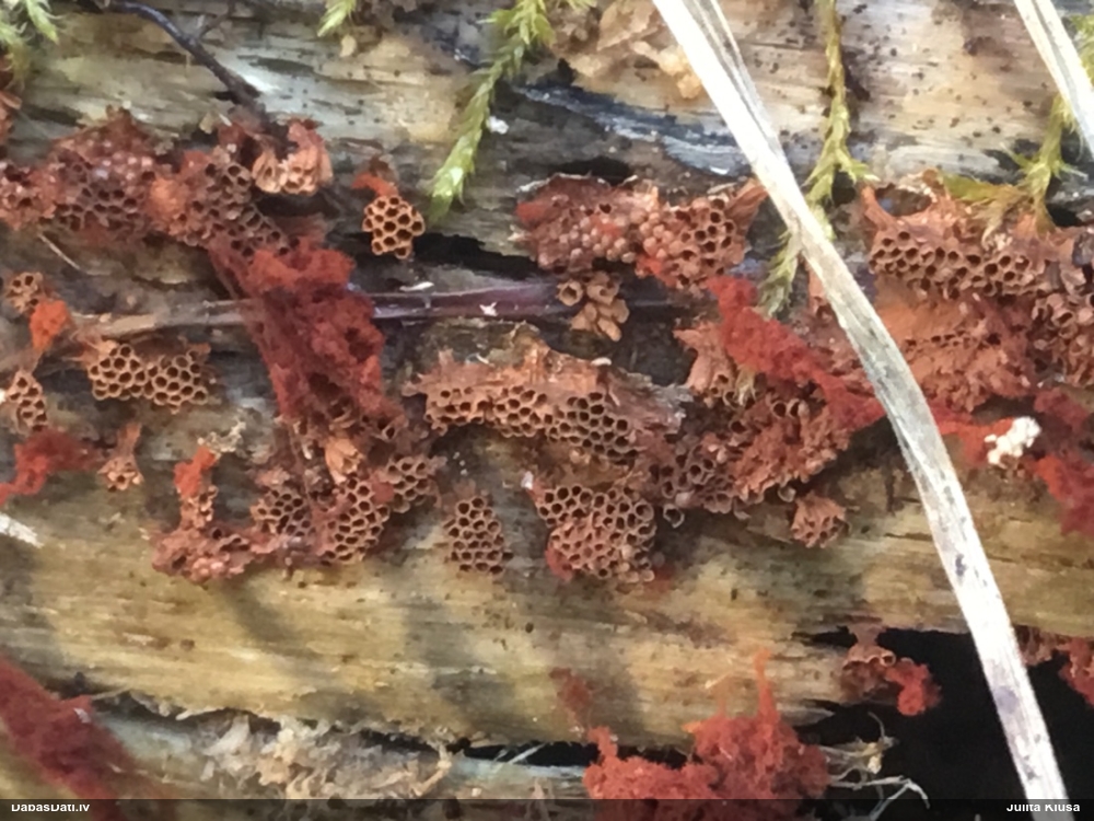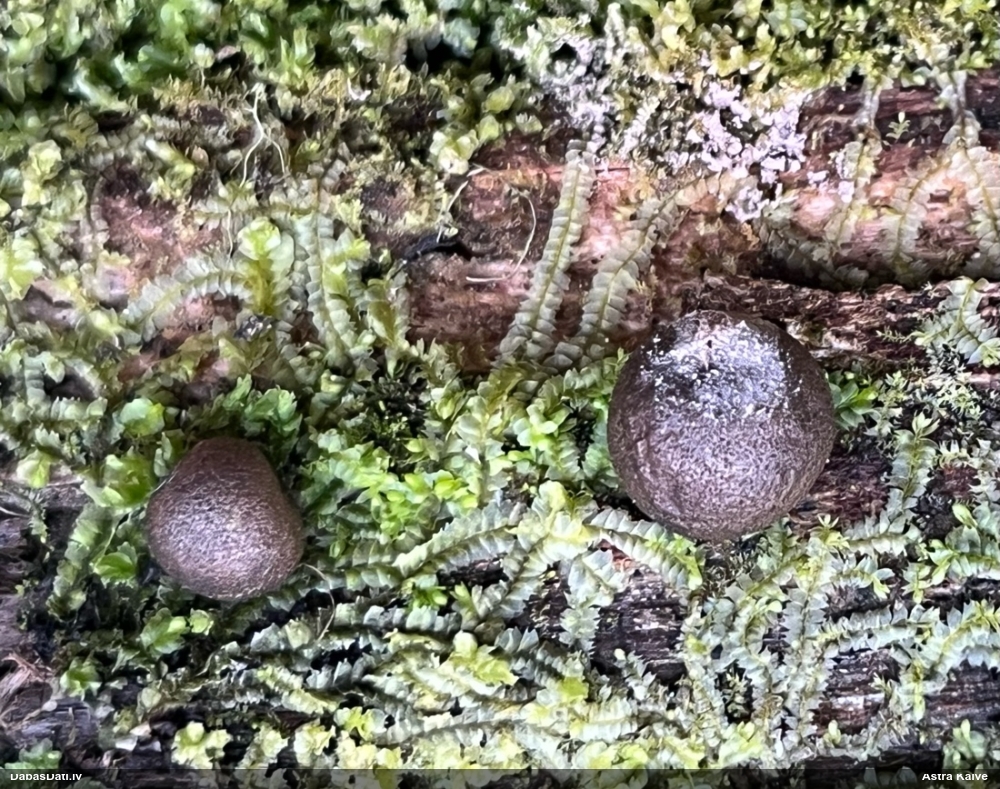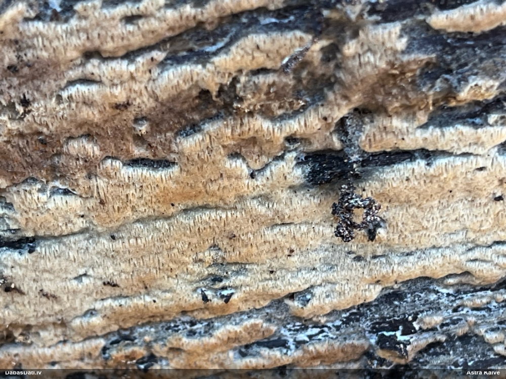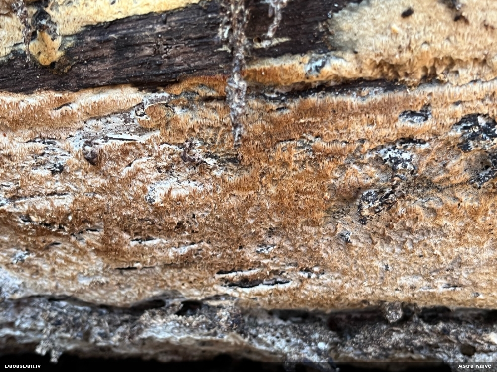 Paldies par paraugu! Paraugā augļķermeņi gan bija ļoti cieti, līdz galam nenobrieduši. Jauna eksemplāra krāsa var būt nozīmīga noteikšanā, bet svarīgi arī nobriedināt (turot mitrākā vietā), citādi perīdiju noņemt mikroskopēšanai ir praktiski neiespējami. Šajā gadījumā mazu gabaliņu izdevās atmiekšķēt un nodabūt, kas sarežģītākos gadījumos varētu būt nepietiekami. Pēc izmēra un perīdija pazīmēm te varētu būt divi varianti L.irregularis un L.epidendrum, kas esot viens no grūtāk atšķiramajiem sugu pāriem. L.epidendrum vairāk raksturīgi, kā es tos saucu, pārstaipi uz augļķermeņa virsmas, kas te ir ļoti labi redzami, tāpēc izšķīros par parastāko sugu.