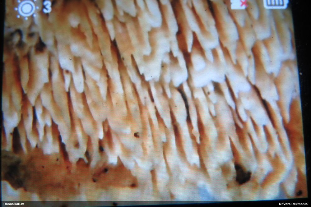 Rūtiņa ir 1mm, par kājiņu es arī nevaru saprast - drīzāk nav nekā ir :) Nobriedušas ir netīri pelēkbaltas ar ļoti trauslu perīdiju. Pagaidām daivās neplaisā, grūti pateikt, kā plaisā, ja nepieskaras augļķermeņiem. "Kraukšķīgs perīdijs", tas ir kā? Pie mazākā pieskāriena tas saplīst gabaliņos, bet vai kraukšķ? :) Sarkans nav, iekšpuse perīdijam balta, bet pskatīšos vēl.