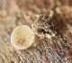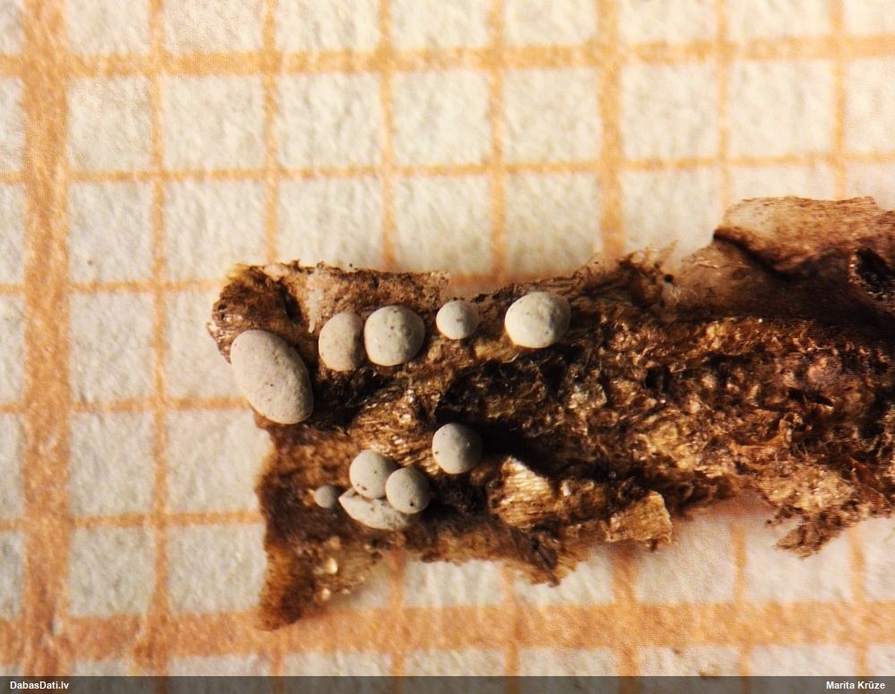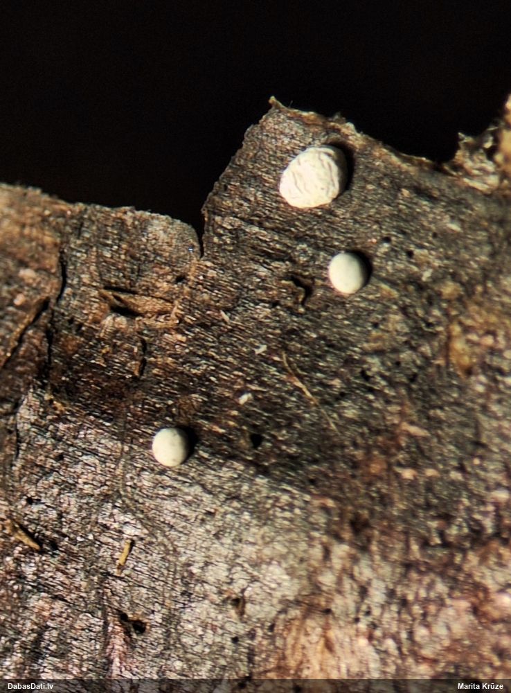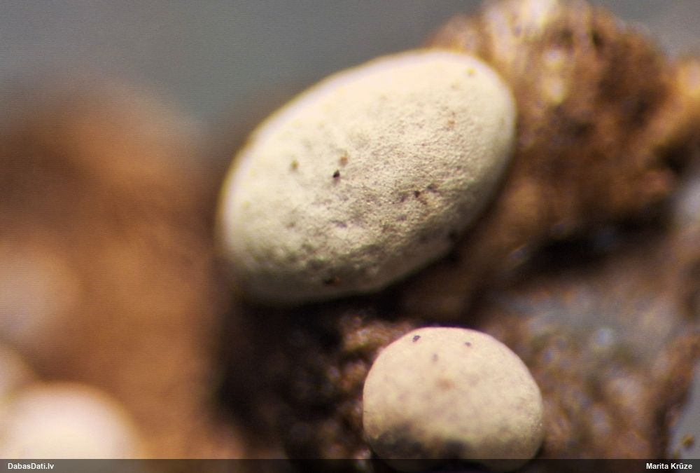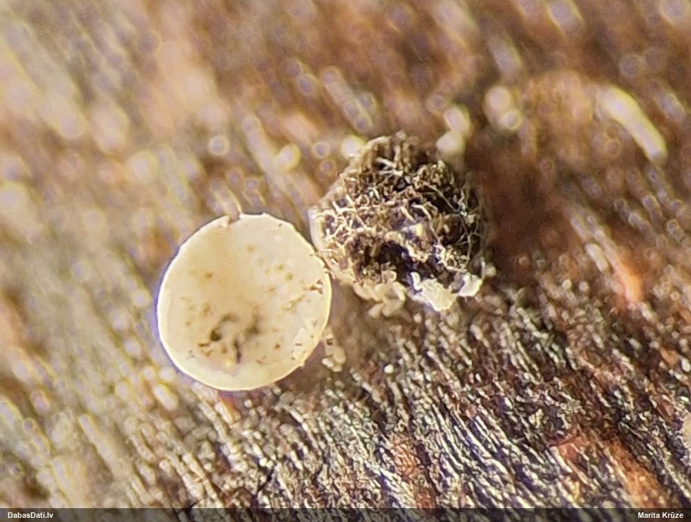 Rūtiņa ir 1 mm? (nevis 0,5 mm?) Par kājiņu nevar saprast, drīzāk izskatās, ka nav, vai nu ļoti īsa? Nobrieduši augļķermeņi nepaliek balti, bet paliek brūni? Plaisā neregulāri (ne daivās)? Man te tuvākā sanāca Diderma subincarnatum, kas ir grupās, netīras miesas krāsā, ar lielu kolumellu un kapilīcija zīmējums ir tieši tāds - caurspīdīgs ar kārpām. Sporas 13-16 mkm, viena puse gaišāka. Bet diametrs minēts 0,5-1 mm, kolumella krēmkrāsas/miesaskrāsas, raupja (te izskatās gluda), un aug nobirās, ne uz kritalām. Diderma subincarnatum aprakstā minēts, ka šī suga ir viegli nosakāma pēc kraukšķīgā(? crustose) perīdija, sarkanīguma(?), sēdošiem augļķermeņiem un lielajām sporām. Kopskats ir līdzīgs starojošajai olītei, bet tai sporām būtu jābūt mazākām, 9-12 µm, un nav viena puse gaišāka, nu un plus jāatveras kā ziedam (kas nepilnīgi nobriedušam var nebūt).