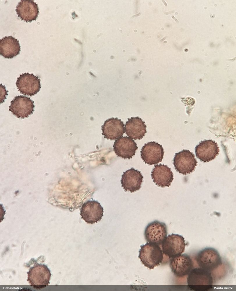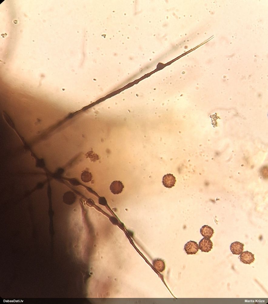 Sporas 12.5-14 (17), viena puse tām izteikti gaišāka. Kapilīcija pavedieni bezkrāsaini ( cik nu izdevās saskatīt) ar kārpām.