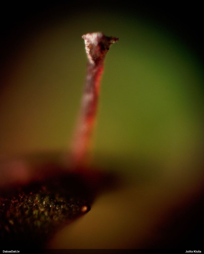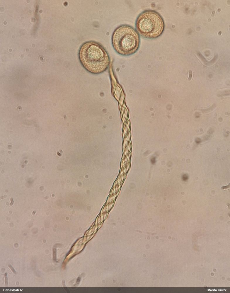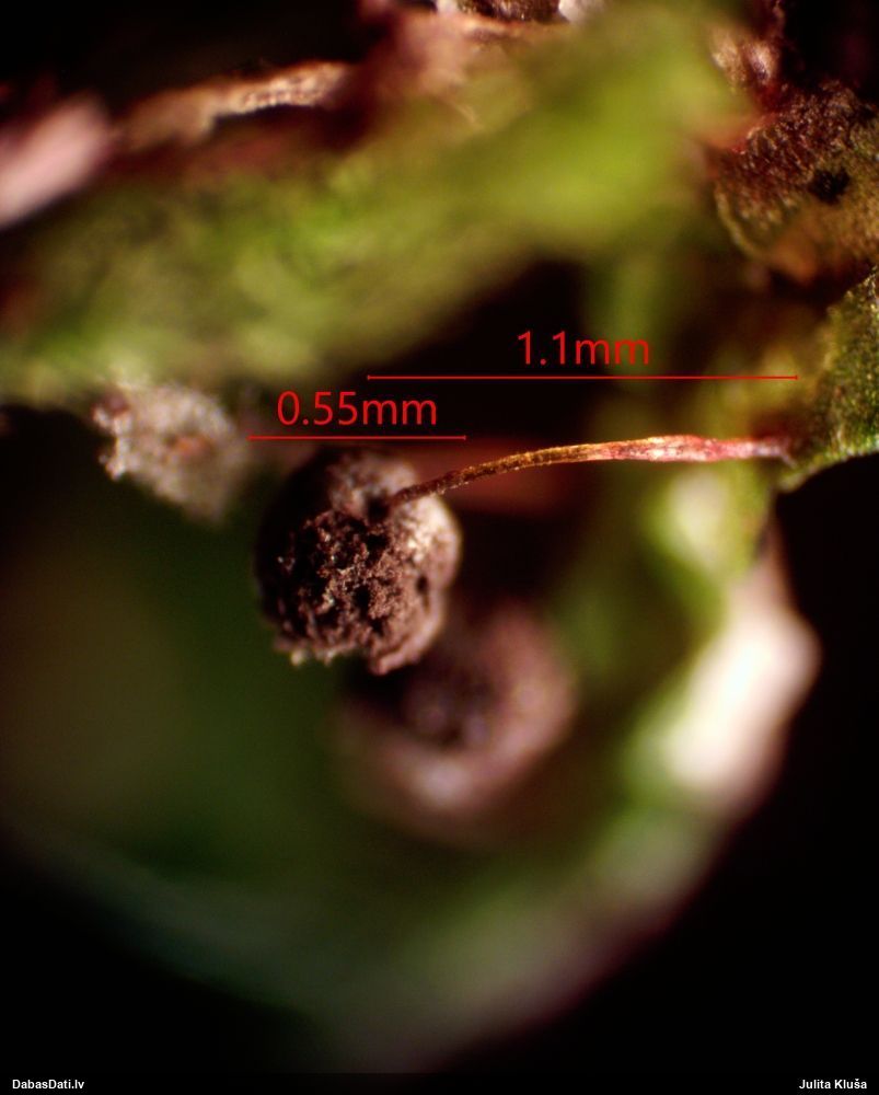 Riskēju, neredzot mikroskopijas foto, bet uz ābelēm vajadzētu būt H.karstenii. A.Kunts teica, ka uz ābelēm esot bieži sastopama Trichia contorta (plašā nozīmē), bet aizdomājās, ka man varētu būt taisnība, ka šaurā nozīmē varētu būt arī H.karstenii, - tiktāl viņš neesot iedziļinājies. Bet "spurainais apraksts" mikroskopijai liecina par H.karstenii, kādu es to saprotu.