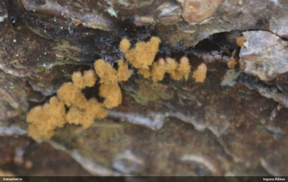 Mazie dzīves prieciņi! :) Lūk, pie kā noved cilvēku iedvesmošana uz gļotsēņošanu, nepieciešamas tikai pareizi iestatītas un sugu redzošas acis. Paraugs tika ķidāts ar pietāti, vēl ir pietiekami daudz materiāla. Atrašanai noteikti jāizmanto 40x lupa ar gaismiņu, bez tās neiztikt. Konkrētā sveķainā egle atšķīrās no visām pārējām, bija noliekusies 45 grādu lenķī, pasargāta no tiešiem nokrišņiem. Īpaša uzmanība jāvelta samtaini melnajam micēlijam, ar ko noklātas senas sveķainas rētas. Ja tiek ieraudzīti gļotsēnes augļķermeņi, tad viss uzreiz kļūst skaidrs. Tie ir pietiekami izteiksmīgi. Novēlu veiksmes visiem, kuri vēlas šo būtni ieraudzīt savām acīm! Vakar pārskatīju arī citas DMB audzes, tomēr bez sekmēm. Tomēr prasības pret dzīvotni nav gluži izšķirošas, Dānijā atrasta arī stādītās mono-audzēs. Jāturpina meklēt retās sugas :)