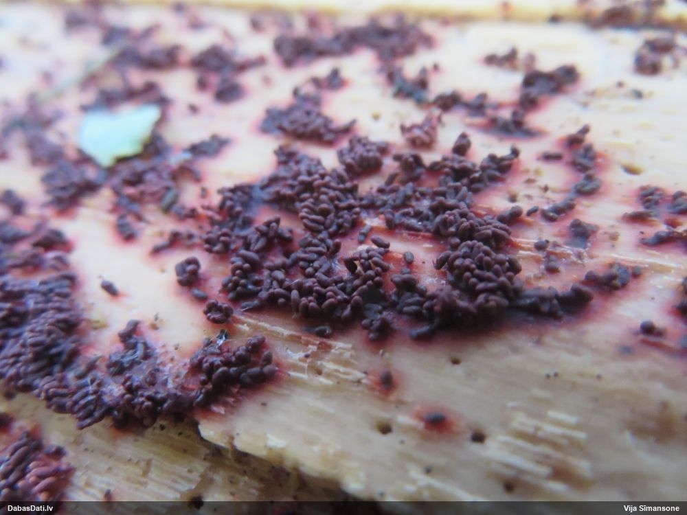 Ja uz beigta koka, tad ticamākā laikam ir B.affinis var. microspora, lai gan tā aug uz mizas. Bet varbūt tieši apakšā gļotsēnēm ir kādi mizas fragmentiņi?