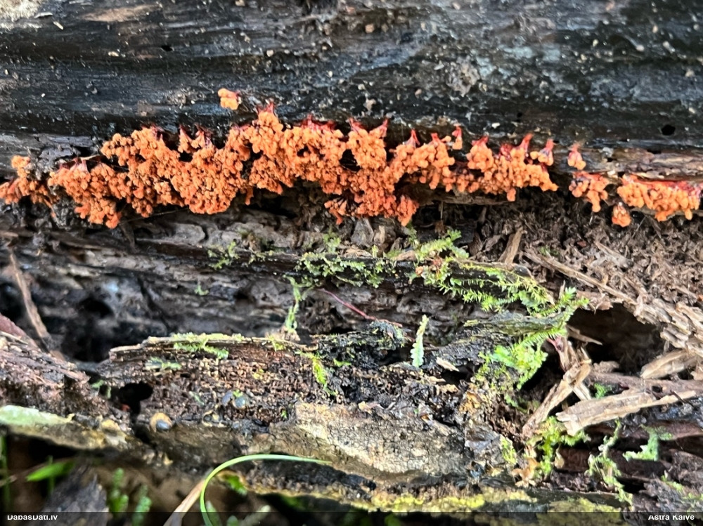 Mazie dzīves prieciņi! :) Lūk, pie kā noved cilvēku iedvesmošana uz gļotsēņošanu, nepieciešamas tikai pareizi iestatītas un sugu redzošas acis. Paraugs tika ķidāts ar pietāti, vēl ir pietiekami daudz materiāla. Atrašanai noteikti jāizmanto 40x lupa ar gaismiņu, bez tās neiztikt. Konkrētā sveķainā egle atšķīrās no visām pārējām, bija noliekusies 45 grādu lenķī, pasargāta no tiešiem nokrišņiem. Īpaša uzmanība jāvelta samtaini melnajam micēlijam, ar ko noklātas senas sveķainas rētas. Ja tiek ieraudzīti gļotsēnes augļķermeņi, tad viss uzreiz kļūst skaidrs. Tie ir pietiekami izteiksmīgi. Novēlu veiksmes visiem, kuri vēlas šo būtni ieraudzīt savām acīm! Vakar pārskatīju arī citas DMB audzes, tomēr bez sekmēm. Tomēr prasības pret dzīvotni nav gluži izšķirošas, Dānijā atrasta arī stādītās mono-audzēs. Jāturpina meklēt retās sugas :)