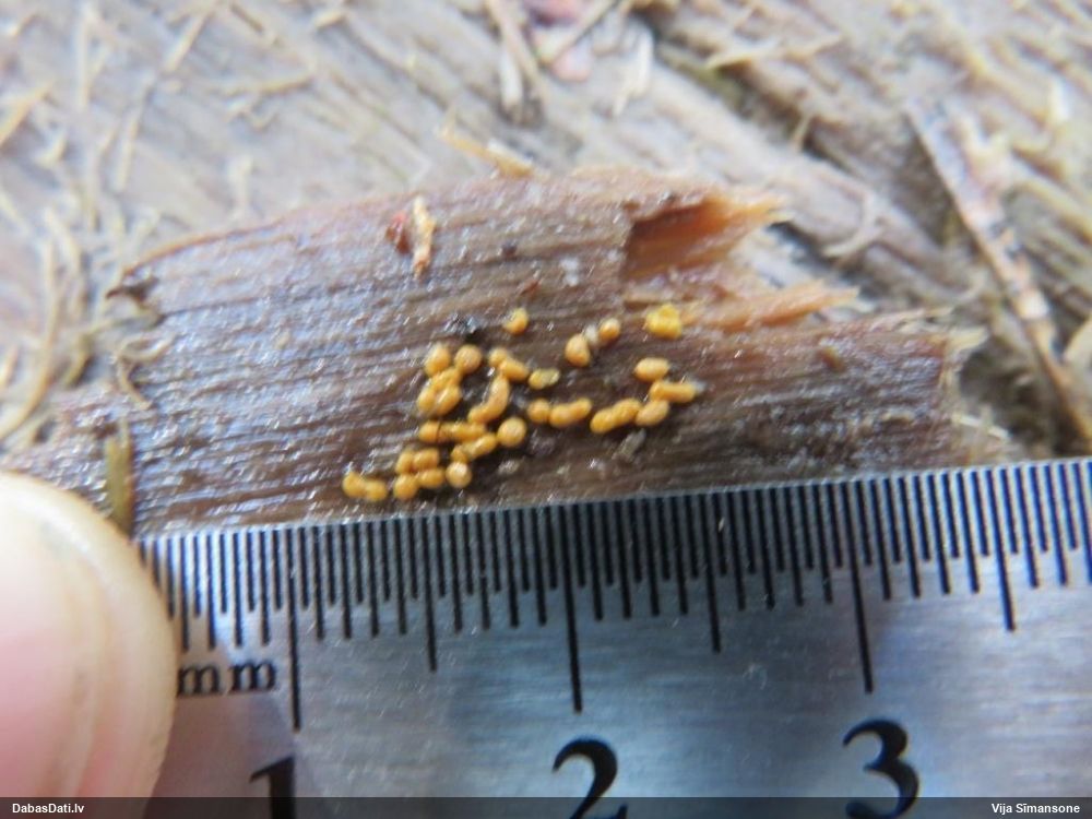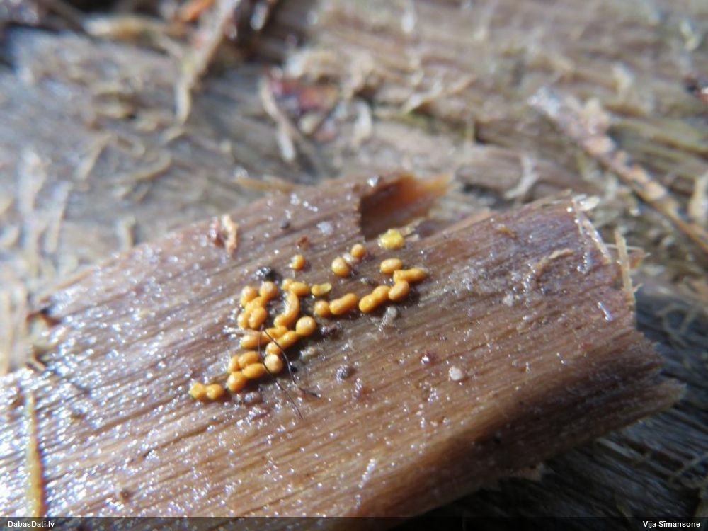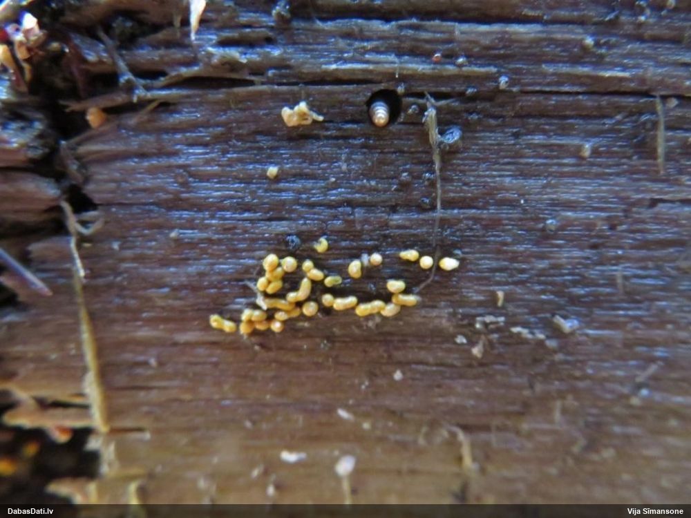 Julitas, šai paņemts paraugs, diezgan izsporojies. Un tai otrai līdzīgajai, kam ieziņots novērojums, arī. Pārliecinājos, ka tiešām egles kritalas. Bet tādu gļotsēņu diezgan daudz, vai uz katras egles kritalas, daudzās vietās stumbram, tagad dzeltenos sporu mākoņus labi redz.