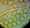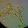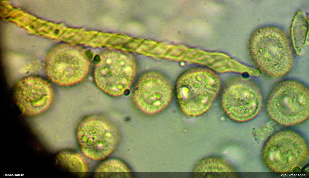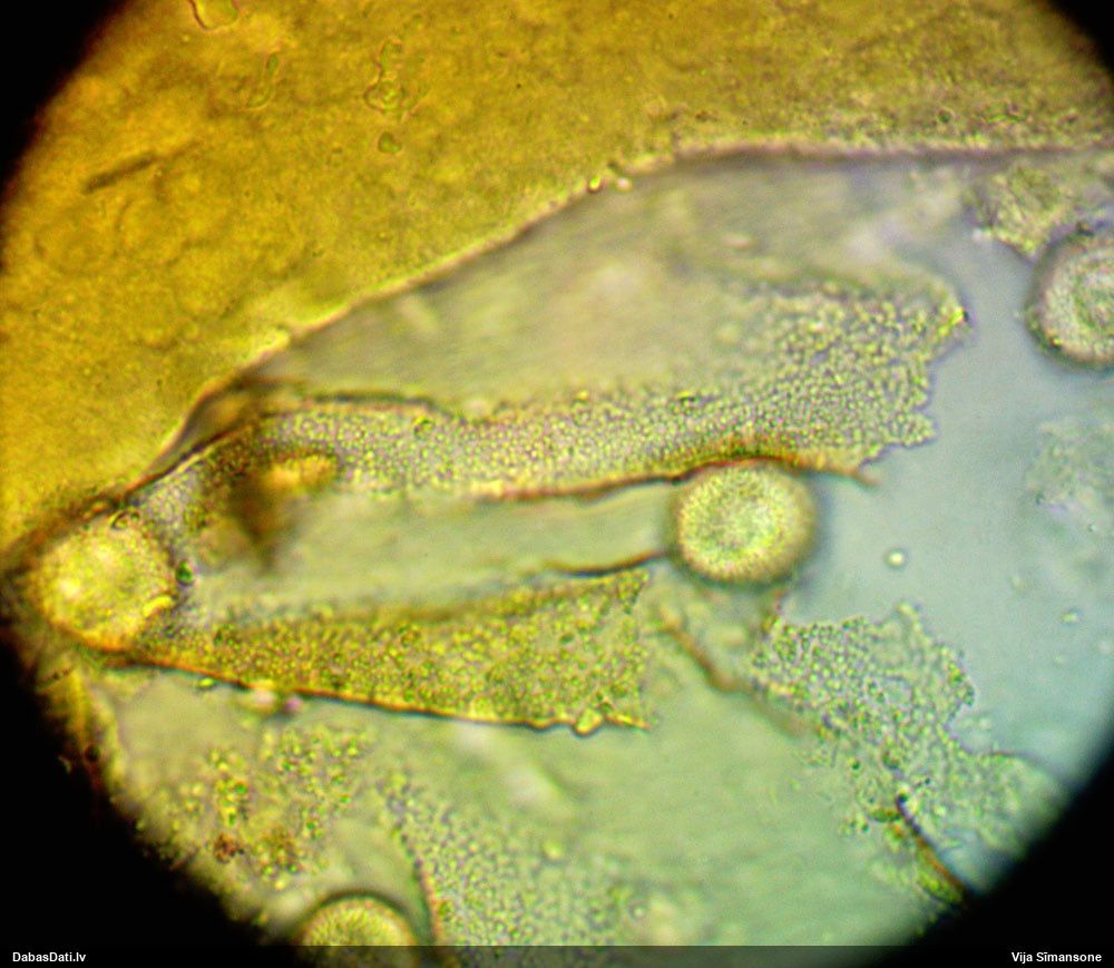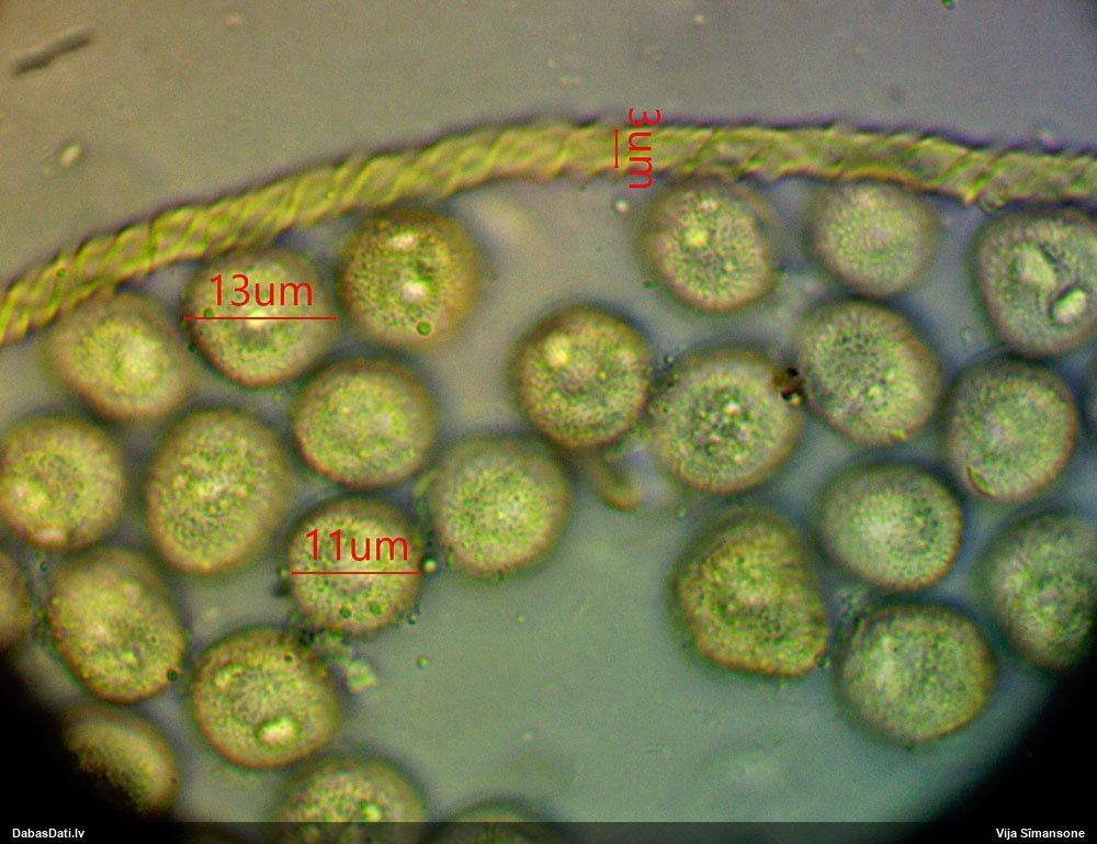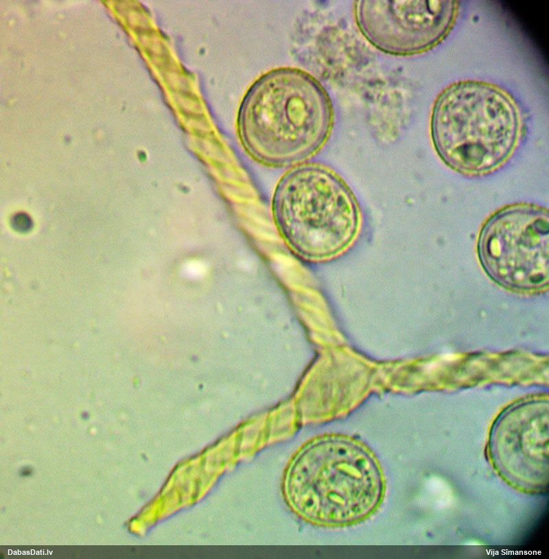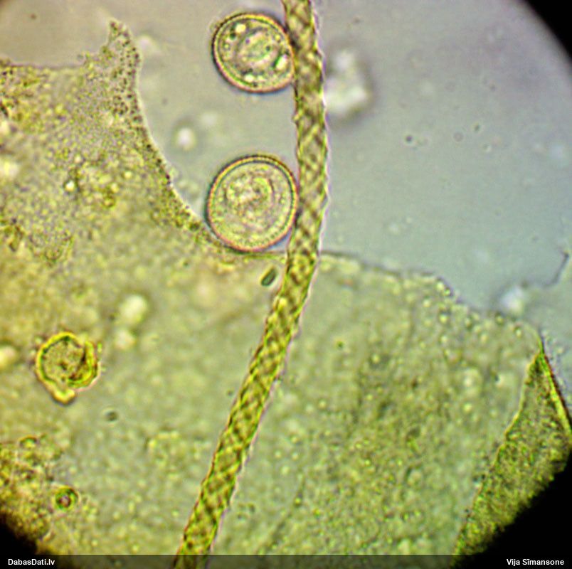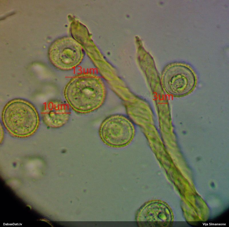 Sporas izskatās ļoti gaišas, varbūt nenobriedušas. Es laikam pēc kāda laiciņa mēģinātu vēlreiz mikroskopēt. Tajā pašā laikā sporu izmēri priekš T.contorta ir pamazi (ja tipiski ir 11-14 mkm, te ir knapi 11 mkm)