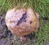 Šis ļoti interesants. Sporas ļoti traumētas, bet tām, kas ir veselas, ir diezgan skaidrs raksts, kas neatbilst nekam no man zināmiem ragansviestiem vai pumpurītēm (pat neņemot vērā izmēru), bet tīri labi atbilst baltapaļajai krāterītei, kas tā nevar būt, jo parauga "ciešais kamoliņš" ir stipri lielāks par tādu. Sporas pēc izmēra varētu atbilst Fuligo licentii, bet no dzeltenā te ir stipri maz. Ja vienīgi ir kāds nobriedušāka attēls, kas rāda, ka ir bijis dzeltens, bet no ilgas stāvēšanas izbalējis.