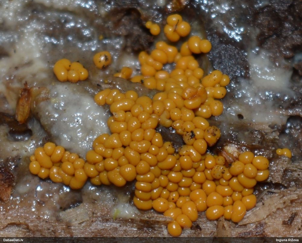 Julitas, šai paņemts paraugs, diezgan izsporojies. Un tai otrai līdzīgajai, kam ieziņots novērojums, arī. Pārliecinājos, ka tiešām egles kritalas. Bet tādu gļotsēņu diezgan daudz, vai uz katras egles kritalas, daudzās vietās stumbram, tagad dzeltenos sporu mākoņus labi redz.