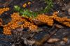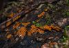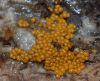 Man pēkšņi radās ideja - vai tur bija nu ļoti mitrs mikroklimats, egle ar melnalksni? Hipotētiski tādas dzeltenas var būt Diachea muscorum. Te bilde ir mazliet līdzīga: https://fr.wikipedia.org/wiki/Fichier:Craterium_muscorum,_Trawscoed,_North_Wales,_Aug_2016_-_Flickr_-_janetgraham84.jpg