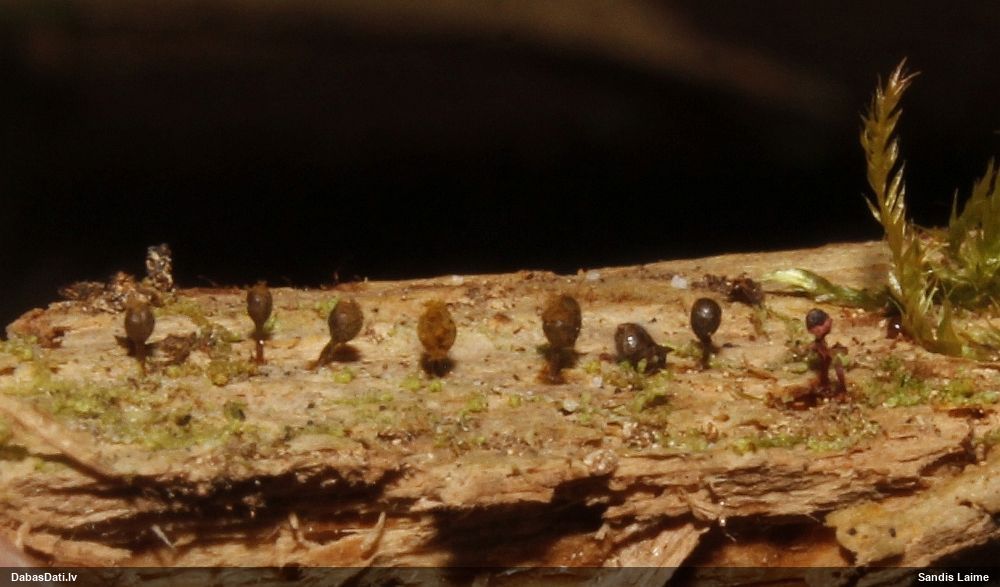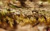 Man pēkšņi radās ideja - vai tur bija nu ļoti mitrs mikroklimats, egle ar melnalksni? Hipotētiski tādas dzeltenas var būt Diachea muscorum. Te bilde ir mazliet līdzīga: https://fr.wikipedia.org/wiki/Fichier:Craterium_muscorum,_Trawscoed,_North_Wales,_Aug_2016_-_Flickr_-_janetgraham84.jpg