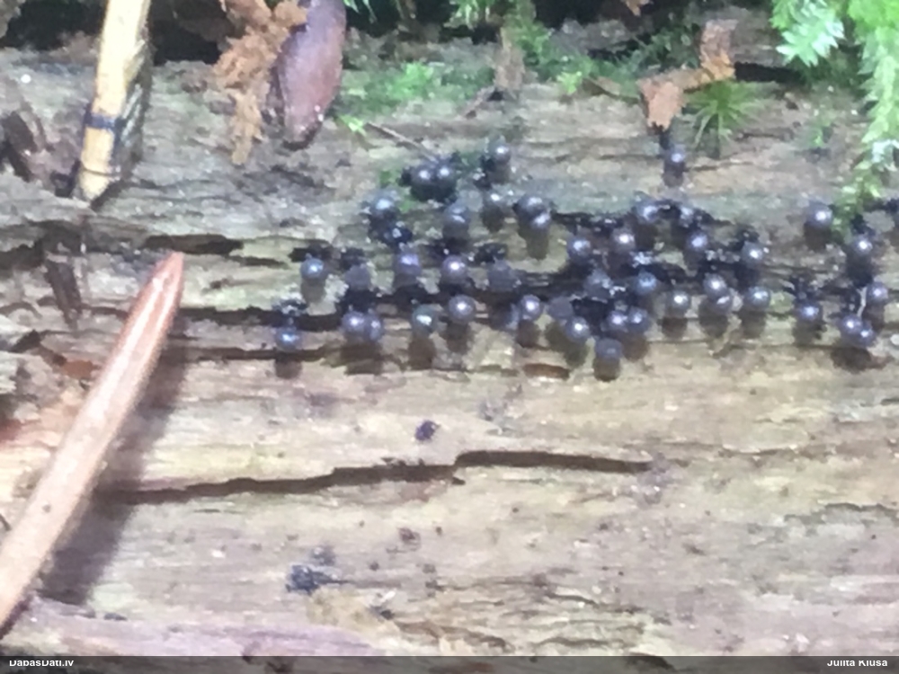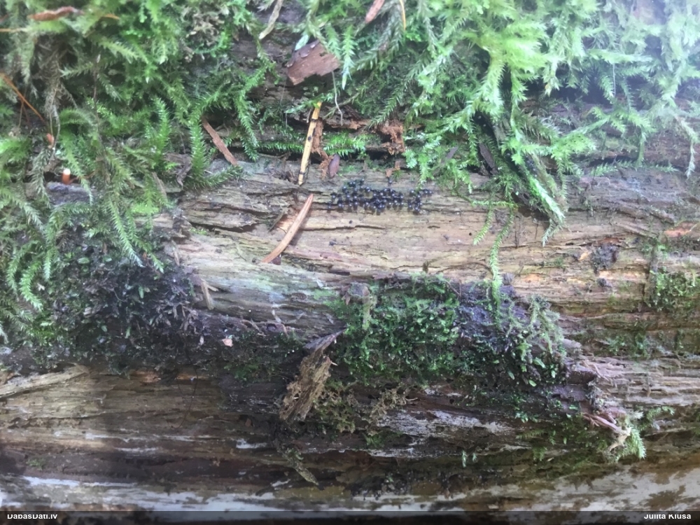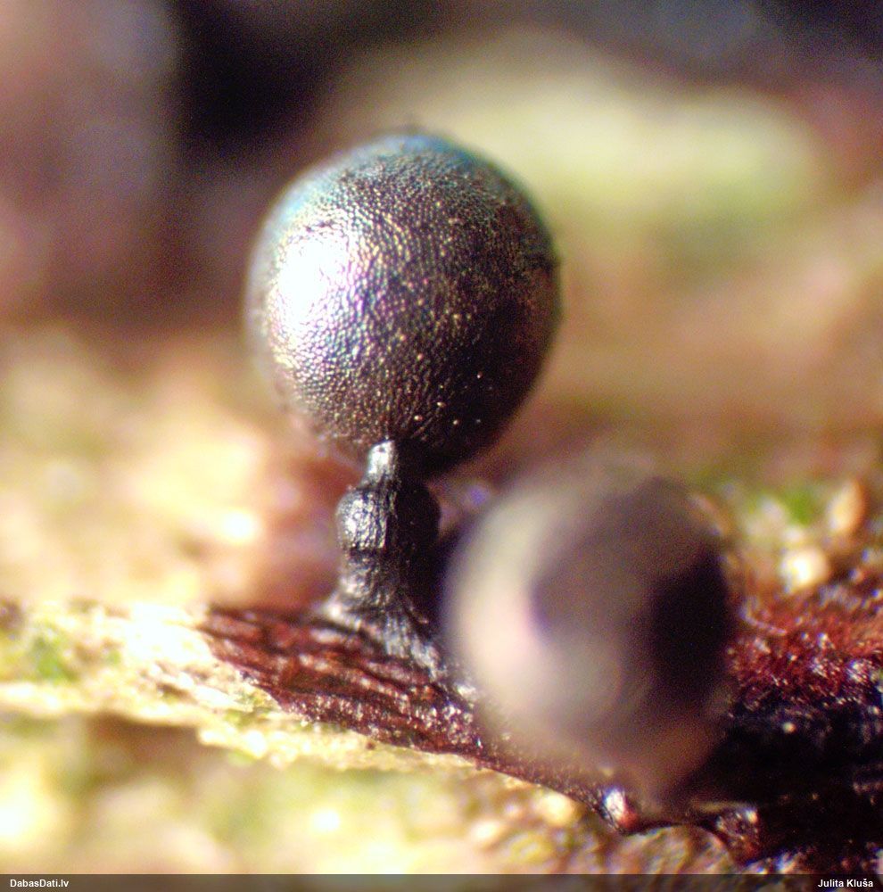 Laikam jau drošāk būs, ja es to paraugu dabūšu pie sevis. Viena non svarīgākajām pazīmēm ir 1 mkm garas adatiņas sporām. Un te es tās pārliecinoši neredzu. Par citām pazīmēm salīdzinu Lamproderma muscorum -- L.violaceum/L.nigrescens (kam arī kapilīcijs galos gaišāks): Sporas 10-12 mkm (Eiropas versijai līdz 14 mkm) -- 8-10 mkm (šajā novērojumā drīzāk 10-12 mkm, kas labāk atbilstu L.muscorum Amerikas versijai) Galviņas diametrs 0,3-0,5 mm -- 0,4-1 mm (šajā novērojumā 0,55-0,65 mm) Kopējais garums 0,6-1 mm -- 0,6-1,8 mm (šajā novērojumā līdz 0,9 mm). Ja sporām būtu skaidri redzamas adatiņas, tad es pieņemtu drīzāk L.muscorum ideju, bet šobrīd šaubos.