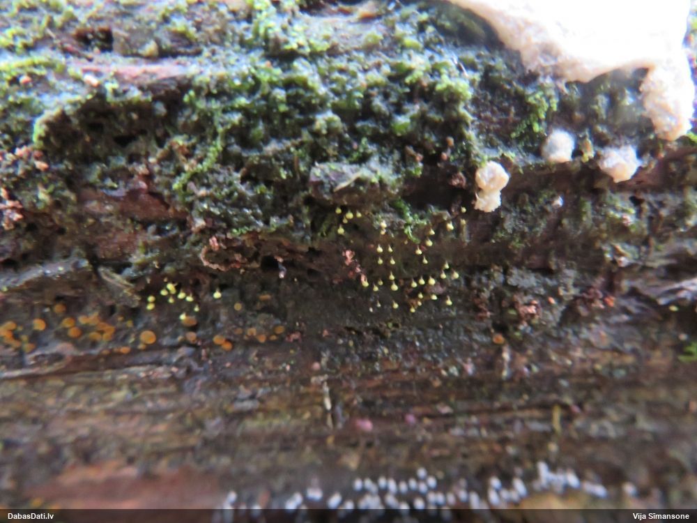 Man pēkšņi radās ideja - vai tur bija nu ļoti mitrs mikroklimats, egle ar melnalksni? Hipotētiski tādas dzeltenas var būt Diachea muscorum. Te bilde ir mazliet līdzīga: https://fr.wikipedia.org/wiki/Fichier:Craterium_muscorum,_Trawscoed,_North_Wales,_Aug_2016_-_Flickr_-_janetgraham84.jpg