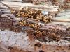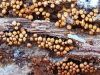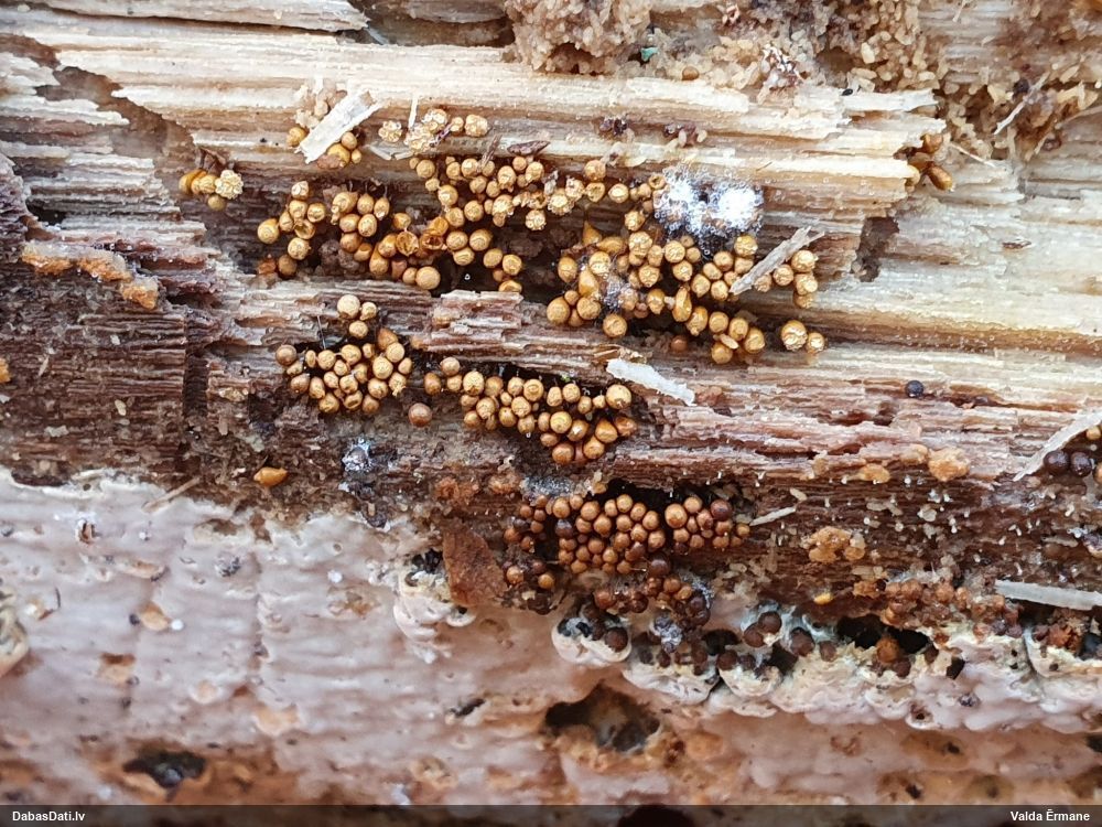 Nevar saprast, uz kā auga - vai tas ir nobirās, vai uz kritalas mizas? Abas hipotēzes ir "pa tēmu", bet man "nepatīk" kopskats, kur skaidri redzams, ka vairāki augļķermeņi ir cieši kopā, bet tas nav raksturīgs ne vienai, ne otrai hipotēzei, kur augļķermeņi tipiski ir nodalīti. Ļoti interesanti, ja ir paraugs, tad kāds tas izskatās tagad, un vispār to vajadzētu mikroskopēt.