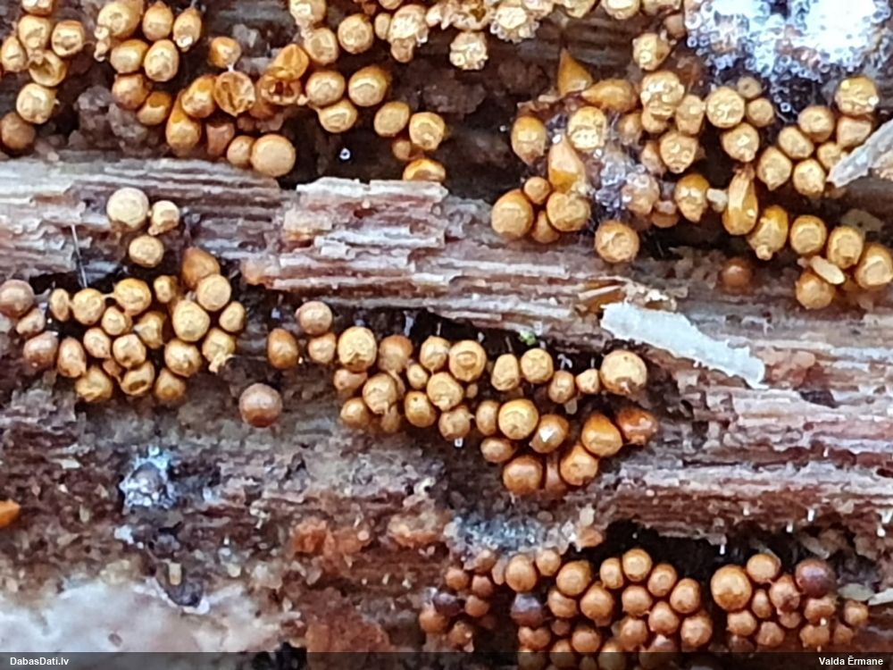 Skatoties uz nelīdzeno virsmu, var būt grubuļainais Fuligo luteonitens, bet droši to varētu pateikt mikroskopijā pēc sporām