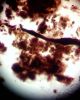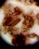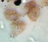 Šis bij pārsteigums. Ievācu bez cerībām, jo sakaltis. Hipotēze par gļotsēni, jo gļotaina apmale. Tā kā balts, sporu nebūs, neko zaudēt nevar, ielēju kastītē ūdeni (pat ne salvetes, vnk "dzīvu ūdeni") un aizmirsu. Krāmējoties pa kastītēm, atveru un - pārsteigums. Plānotā gļotsēne izaugusi 100x lielāka :D un izrādās sēne, kas mitrumā beidzot uzbriedusi. Kā tādu mikroskopēt, gan nezinu, jo tur tak receklis.. Tā ka vai pēdējie 2 mikro-foto par tēmu - nezinu.