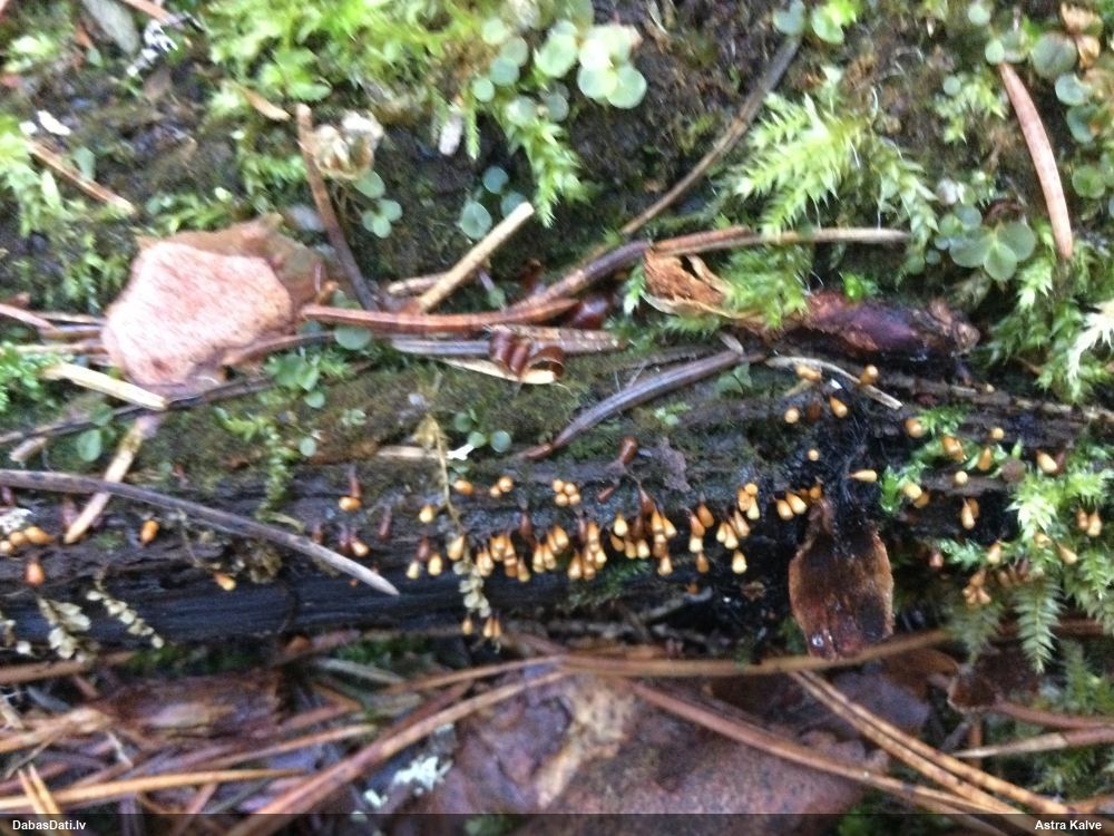 Man pēkšņi radās ideja - vai tur bija nu ļoti mitrs mikroklimats, egle ar melnalksni? Hipotētiski tādas dzeltenas var būt Diachea muscorum. Te bilde ir mazliet līdzīga: https://fr.wikipedia.org/wiki/Fichier:Craterium_muscorum,_Trawscoed,_North_Wales,_Aug_2016_-_Flickr_-_janetgraham84.jpg