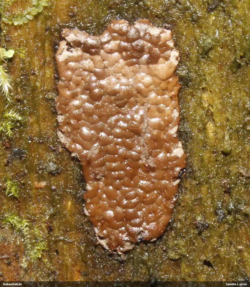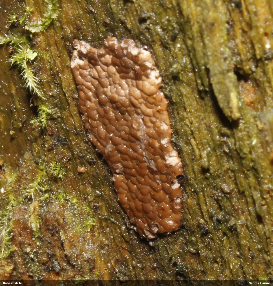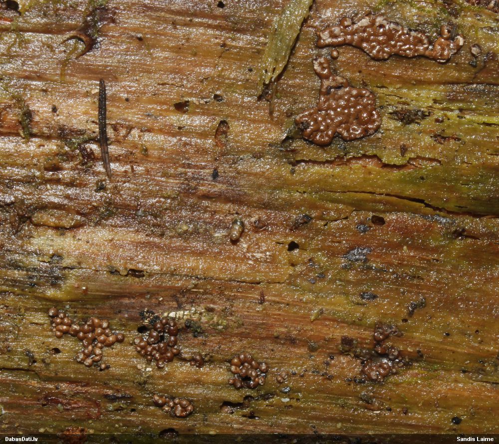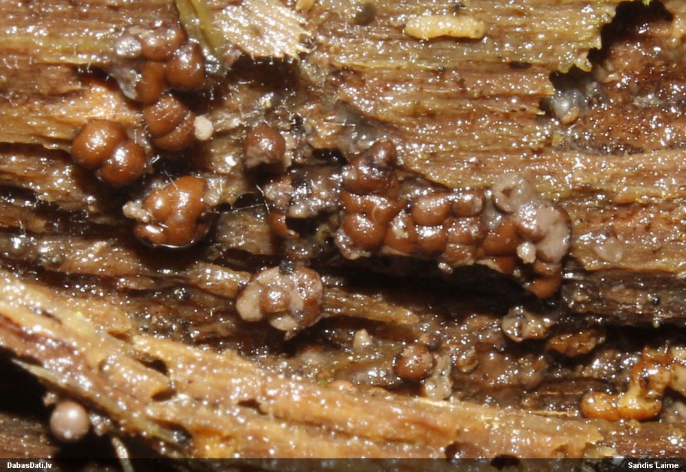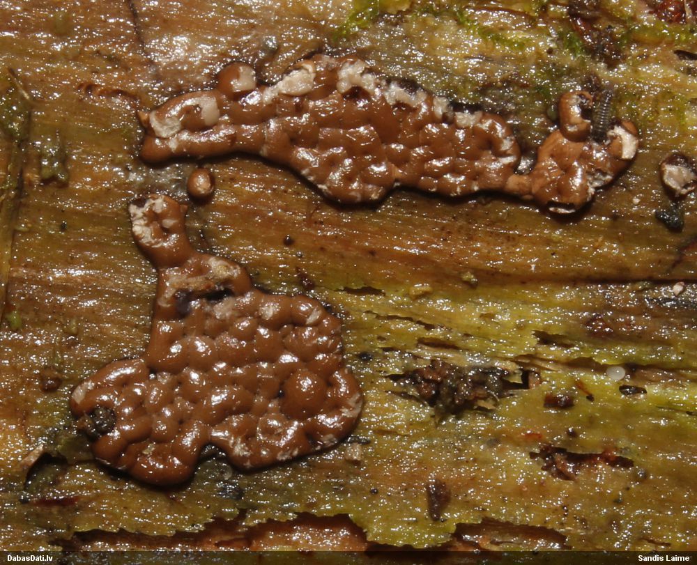 Skatoties uz nelīdzeno virsmu, var būt grubuļainais Fuligo luteonitens, bet droši to varētu pateikt mikroskopijā pēc sporām