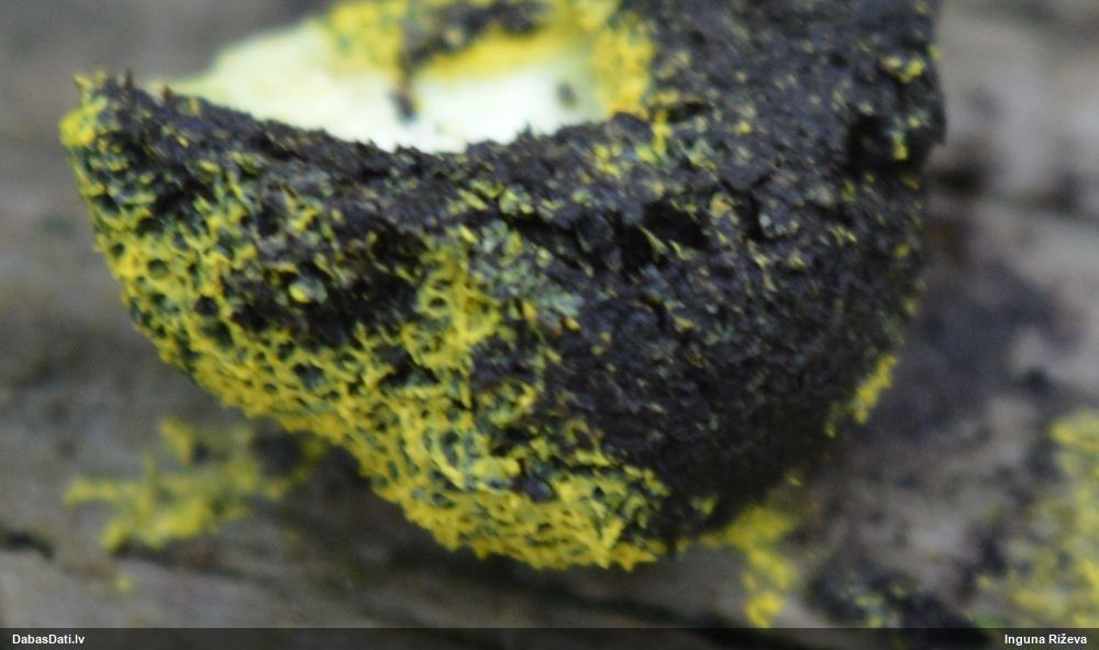 Šis ļoti interesants. Sporas ļoti traumētas, bet tām, kas ir veselas, ir diezgan skaidrs raksts, kas neatbilst nekam no man zināmiem ragansviestiem vai pumpurītēm (pat neņemot vērā izmēru), bet tīri labi atbilst baltapaļajai krāterītei, kas tā nevar būt, jo parauga "ciešais kamoliņš" ir stipri lielāks par tādu. Sporas pēc izmēra varētu atbilst Fuligo licentii, bet no dzeltenā te ir stipri maz. Ja vienīgi ir kāds nobriedušāka attēls, kas rāda, ka ir bijis dzeltens, bet no ilgas stāvēšanas izbalējis.