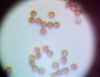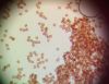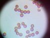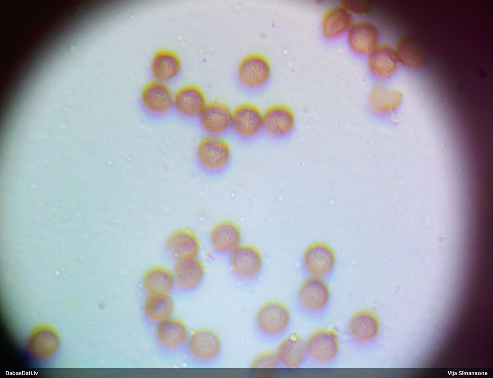 Sporu izmēri ir tieši starp rufu (6-7 mkm) un dzelteno (7-8 mkm) - nav brīnums, ka izskatās arī kkas pa vidam :D. Bet nu paraugā paliekas izskatās tīri dzeltenas, rūsganais nav parādījies, un sporām arī "velk" vairāk uz 8 mkm nekā uz 6 mkm, tā ka būs vien flava. Liels paldies, vēl viena laba pieredze ar jaunas krāsu un mikroskopiju!