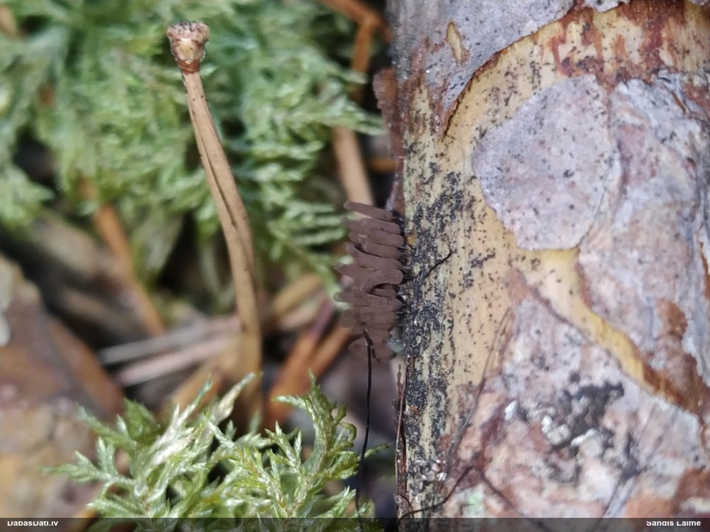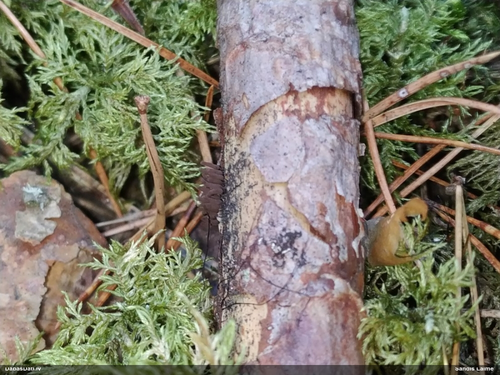 Piezīmes/Nolūzis resna īkšķa resnuma priedes zars 2 (sākusi nolobīties miza), uz koksnes zara apakšpusē, atrasta tikai pēc zara pacelšanas un apskatīšanas no visām pusēm, par.l. p85