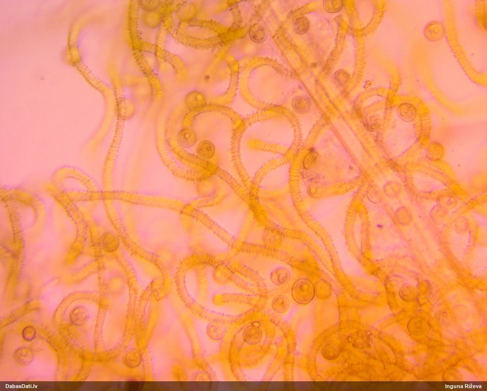 Žēl, ka mikroskopijā neviens kapilīcija mezgls (un vnk pavedieni) nav "aizķēries" (bet varbūt citos foto ir?), jo varētu būt F.licentii. Ovālo sporu gan jau arī netrūkst, kam šādā stadijā varētu arī nepievērst uzmanību un nesamērīt (bet būtu vajadzējis).