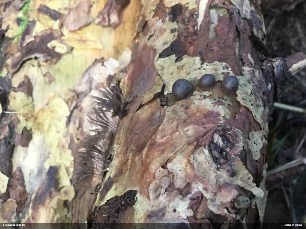 Atradu labu aprakstu. Tur teikts, ka P.diderma var būt kapilīcija mezgli, kas cieši salipuši, veidojot pseidokolumellu. Domāju, tā ir arī te. Rakstīts, ka aug arī uz mizas, neminot, vai dzīviem kokiem. Domāju, ka pretrunu nav, katrā ziņā šobrīd tā ir vienīgā un gana ticama versija.