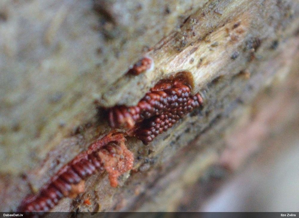 Liels paldies par paraugu! Mikroskopēju, viss kārtībā, kapilīcijs ir un suga pareiza. :) Un kā jau ir gadījies - tikko saņemu un apskatu paraugu, tā uzreiz ekspedīcijā izdodas atrast arī pašai (1 gab. augļķermeni :D). Ir pilnīgi droši, Raivo, bez Tava atraduma es arī nebūtu atradusi, jo uzmanību pievērsu, ka egle bija tieši tāda pati - slīpa un melna, tāpēc īpašs paldies par biotopa un substrāta bildēm! Kad ieraudzīju koka atbilstību, tad meklēju, kamēr atradu. :)