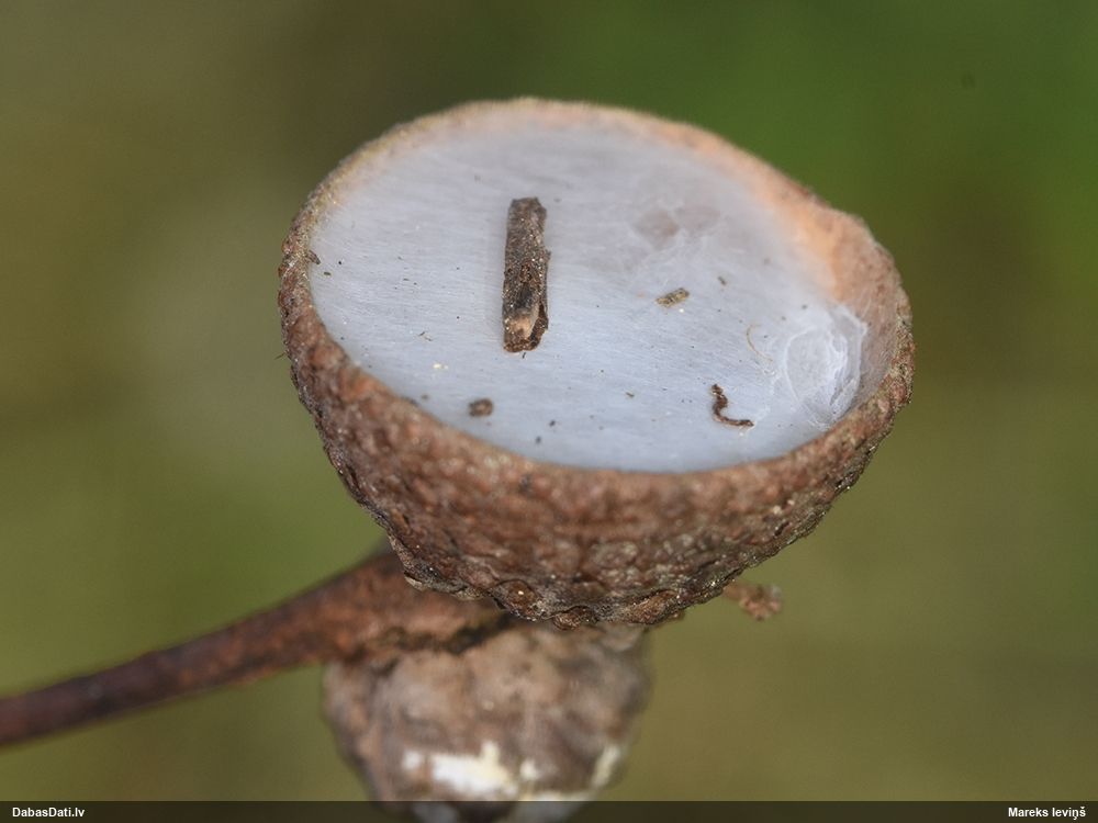 Rūtiņa ir 1 mm? (nevis 0,5 mm?) Par kājiņu nevar saprast, drīzāk izskatās, ka nav, vai nu ļoti īsa? Nobrieduši augļķermeņi nepaliek balti, bet paliek brūni? Plaisā neregulāri (ne daivās)? Man te tuvākā sanāca Diderma subincarnatum, kas ir grupās, netīras miesas krāsā, ar lielu kolumellu un kapilīcija zīmējums ir tieši tāds - caurspīdīgs ar kārpām. Sporas 13-16 mkm, viena puse gaišāka. Bet diametrs minēts 0,5-1 mm, kolumella krēmkrāsas/miesaskrāsas, raupja (te izskatās gluda), un aug nobirās, ne uz kritalām. Diderma subincarnatum aprakstā minēts, ka šī suga ir viegli nosakāma pēc kraukšķīgā(? crustose) perīdija, sarkanīguma(?), sēdošiem augļķermeņiem un lielajām sporām. Kopskats ir līdzīgs starojošajai olītei, bet tai sporām būtu jābūt mazākām, 9-12 µm, un nav viena puse gaišāka, nu un plus jāatveras kā ziedam (kas nepilnīgi nobriedušam var nebūt).