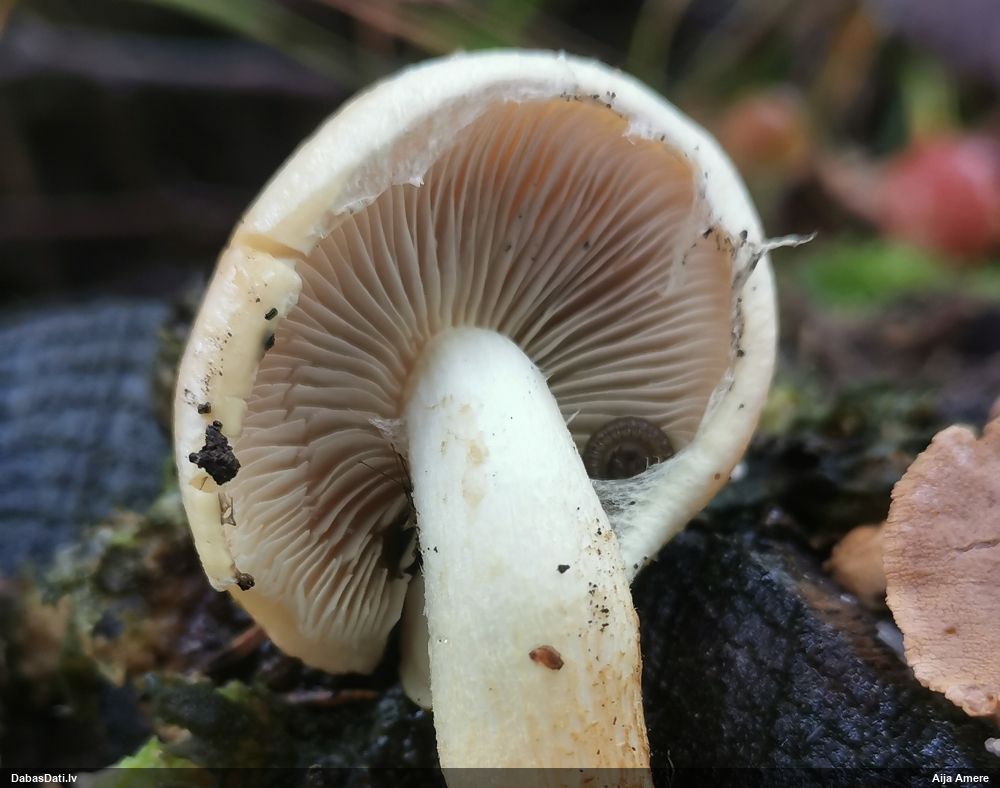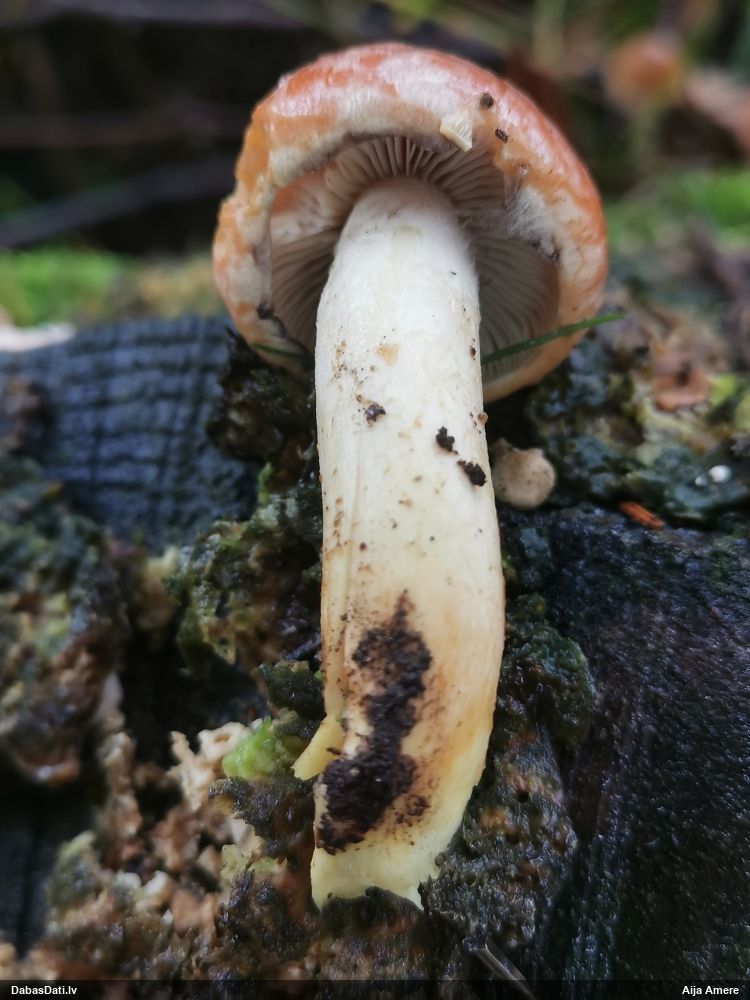 Rūtiņa ir 1mm, par kājiņu es arī nevaru saprast - drīzāk nav nekā ir :) Nobriedušas ir netīri pelēkbaltas ar ļoti trauslu perīdiju. Pagaidām daivās neplaisā, grūti pateikt, kā plaisā, ja nepieskaras augļķermeņiem. "Kraukšķīgs perīdijs", tas ir kā? Pie mazākā pieskāriena tas saplīst gabaliņos, bet vai kraukšķ? :) Sarkans nav, iekšpuse perīdijam balta, bet pskatīšos vēl.