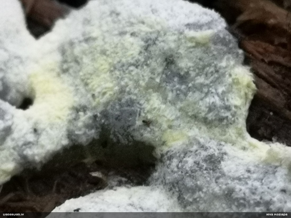 Šis ļoti interesants. Sporas ļoti traumētas, bet tām, kas ir veselas, ir diezgan skaidrs raksts, kas neatbilst nekam no man zināmiem ragansviestiem vai pumpurītēm (pat neņemot vērā izmēru), bet tīri labi atbilst baltapaļajai krāterītei, kas tā nevar būt, jo parauga "ciešais kamoliņš" ir stipri lielāks par tādu. Sporas pēc izmēra varētu atbilst Fuligo licentii, bet no dzeltenā te ir stipri maz. Ja vienīgi ir kāds nobriedušāka attēls, kas rāda, ka ir bijis dzeltens, bet no ilgas stāvēšanas izbalējis.