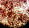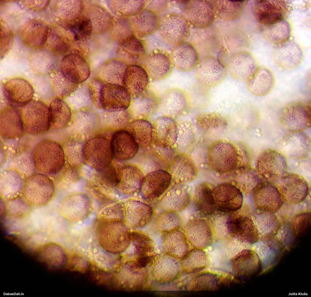 Ko pēc mikroskopētā var secināt: * sporas ir tumšas, tātad ir cukurīšu (Didymiaceae) vai pumpurīšu dzimta (Physaraceae) * sporas ir gan plusmīnus apaļas, gan garenas, gan vēl visādi izlocītas, tātad paraugs nav pilnvērtīgi nobriedis, jo normāli sporām jābūt visām līdzīgas formas, katrā ziņā vismaz pret vienu asi simetriskām. Ja ir nepilnvērtīgi nobriedis paraugs, tad sporu izmēram jāņem mazākās simetriskākās sporas. Šajā gadījumā normāli būtu jābūt apaļām sporām, tāpēc garenajām nevajadzētu mērīt pa garāko diametru. Labāk pamaklēt iespējami apaļākās sporas. * Ja sporas ir deformētas, tad mērījumus vajag veikt vairākkārtīgi, nu vismaz 3 reizes, vai nu tajā pašā mikroskopijā vēl arī pavisam citā vietā, vai labāk pavisam jaunu porciju sporu paņemt no tā paša (ja maz augļķermeņu) vai vēl labāk no kāda hipotētiski labāk nobrieduša augļķwermeņa. Tad varēs labāk nojaust, cik varētu būt normālu sporu diametrs, resp., vai visos gadījumos ir līdzīgi izmēri, vai arī tie ļoti "lēkā", tad jāskatās, kurā gadījumā bija normālākās (tipiski arī mazākās) sporas. * Pēc attēlā ar mērījumiem redzamā es secinātu, ka sporu izmērs orientējoši ir 12-13 mkm. Sporām vērts mērīt (secināt) ar precizitāti līdz 0,5 mkm, lielākai "precizitātei" nav jēgas, jo tur nāk klāt arī mērījuma kļūda. Tomēr te ir tikai viens mērījums dažām redzamām sporām, tāpēc droši pateikt nevar. * Tumšsporainajām ļoti svarīgs ir sporu raksts, kuru var palaimēties nomanīt arī nepilnīgi nobriedušām sporām, kas reizēm "glābj", ja sporu izmēru precīzi grūti pateikt. Ļoti nenobriedušām sporām diemžēl arī raksts mēdz būt nenobriedis. Konkrētajā gadījumā, ja tiešām būtu jāizšķiras starp Physarum psittacinum un Diderma tigrinum (es patiesībā cerētu vispār uz jaunu sugu Latvijai), tad būtu jāsaskata, vai ir vienmērīgi izvietotas kārpas (Diderma tigrinum) vai kārpas ar tumšāku kārpu grupām (Physarum psittacinum). Mikroskopijā es kārpas īsti neredzu vispār, tāpēc man ir jautājums, vai tas ir tāpēc, ka sporas pagalam nenobriedušas (it kā tik traki nevajadzētu būt) vai arī mikroskopijā nav pareizi fokusēts (vajag fokusēt šauri uz sporas centru, lai redz rakstiņu) Attiecīgi par sporu rakstu es neko nevaru pateikt. * kapilīcijs gļotsēņu "pamatu" noteikšanai (kāda dzimta, ģints) ir pats svarīgākais. Ja nav kapilīcija, tad var noteikt tikai dažos izņēmuma gadījumos (lielākoties vienkāršos, vai ja ir liela pieredze). Sporas var izskatīties identiskas arī dažādu dzimtu gļotsēnēm. Lai tiktu pie kapilīcija, sarežģītākos gadījumos uz stikliņa jāņem iespējami viss augļķermenis un, tā kā tas var būt "biezs", tad to starp stikliņiem "izsmērē" tiktāl, lai sāk atsegties (mikroskopijā kļūst redzamas) iekšējās struktūras. Jāredz vismaz kaut kādas daļas, krāsa. Ja tā būtu olīte (Diderma), tad kapilīcijs būtu skaidri brūni-balti pavedieni. Ja tā ir pumpurīte (Physarum), tad pavedieni ir caurspīdīgi un var būt ļoti grūti saskatāmi. Tad jāmeklē kapilīcija mezgli, kas ir apaļu kaļķa granulu sakopojumi. Ja paraugs kārtīgi tiek "izsmērēts" tad tie mezgli arī var "izsmērēties", tad vnk redz, ka paraugs pilns ar apaļām kaļķa granulām (tās redzamas arī šajā mikroskopijā). Vispār apaļas kaļķa granulas ir arī olītēm (uz galviņas), tāpēc pašas par sevi tās neliecina vienas vai otras dzimtas virzienā. Pumpurītēm (Physarum) parasti kapilīciju (t.i., tā mezglus) saskata mazos palielinājumos mikroskopā, vēl neliekot paraugu starp stikliņiem. Tikai jābūt atsegtām iekšējām struktūrām. Tad redz, ka ir tādi kaļķa sakopojumi iekšpusē. Gala secinājumi no tā, kas jau ir redzams - paraugs ir nepilnīgi nobriedis, kas pēc sporu izmēriem vairāk atbilstu Diderma tigrinum (vajag 10-13µm, bet redzamās 12-13µm nepilnīgi nobriedušām sporām ir ļoti atbilstošas), taču olītēm kapilīcijam būtu jābūt vieglāk ievērojamam, tomēr tā te nav. Priekš Physarum psittacinum sporas ir stipri par lielu, ar tādām novirzēm sugu noteikti nevarētu apstiprināt, turklāt būtu jāsaskata tumšāku kārpu grupas. Bet es nepavisam negribētu apstāties pie šīm divām hipotēzēm, kurām biotops īsti neatbilst. Varbūt ir kāda mums mazāk zināma ģints, tāpēc ļoti labprāt saņemtu paraudziņu 28. martā. Tik gari rakstu arī priekš sevis, jo grāmatai man svarīgi saprast, ko iesācējam (un ne tikai) svarīgi izskaidrot, lai tiktu līdz rezultātam. Visi "parastie" noteicēji ir gadījumiem, ja ir visas sastāvdaļas zināmas, un kapilīcijs ir visupirmais.