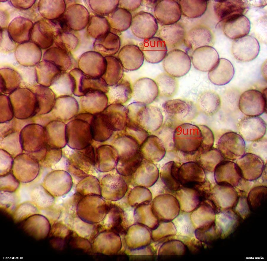 Žēl, ka te nav pielikts mērogs, kā mērīts. Bet ja nepilnīgi nobriedis (par ko liecinātu “iesprūšana” dzelteni-zaļganajā stadijā), tad sporas var izskatīties arī lielākas, nekā vajadzētu