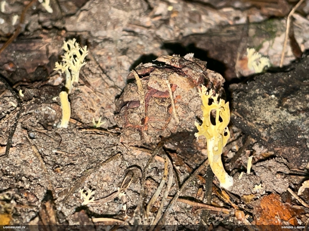 Teiktu, ka medainā bumbulīte. Redz vertikāli izstieptus augļķermeņus (ne pilienveida).