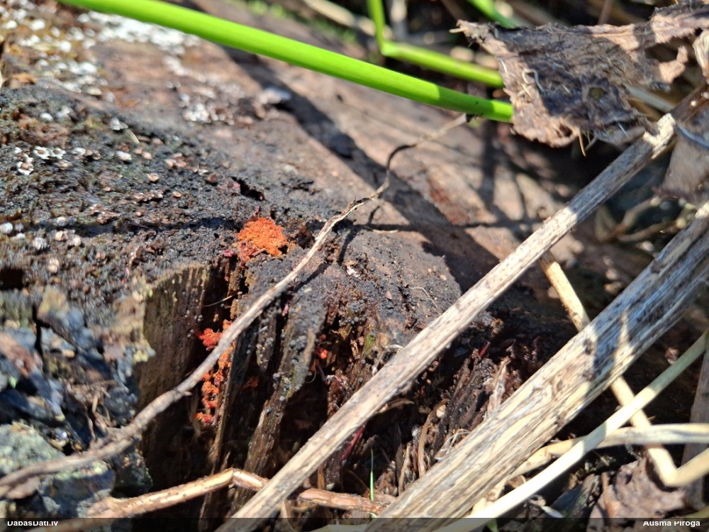Mazie dzīves prieciņi! :) Lūk, pie kā noved cilvēku iedvesmošana uz gļotsēņošanu, nepieciešamas tikai pareizi iestatītas un sugu redzošas acis. Paraugs tika ķidāts ar pietāti, vēl ir pietiekami daudz materiāla. Atrašanai noteikti jāizmanto 40x lupa ar gaismiņu, bez tās neiztikt. Konkrētā sveķainā egle atšķīrās no visām pārējām, bija noliekusies 45 grādu lenķī, pasargāta no tiešiem nokrišņiem. Īpaša uzmanība jāvelta samtaini melnajam micēlijam, ar ko noklātas senas sveķainas rētas. Ja tiek ieraudzīti gļotsēnes augļķermeņi, tad viss uzreiz kļūst skaidrs. Tie ir pietiekami izteiksmīgi. Novēlu veiksmes visiem, kuri vēlas šo būtni ieraudzīt savām acīm! Vakar pārskatīju arī citas DMB audzes, tomēr bez sekmēm. Tomēr prasības pret dzīvotni nav gluži izšķirošas, Dānijā atrasta arī stādītās mono-audzēs. Jāturpina meklēt retās sugas :)