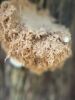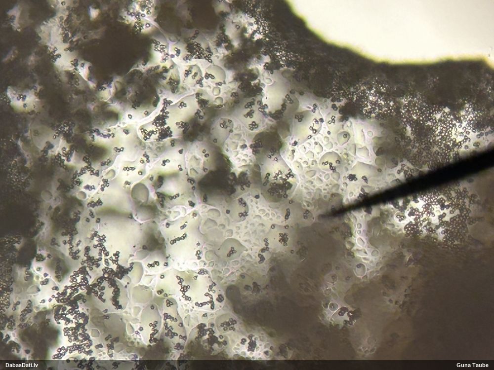 Nevar saprast, uz kā auga - vai tas ir nobirās, vai uz kritalas mizas? Abas hipotēzes ir "pa tēmu", bet man "nepatīk" kopskats, kur skaidri redzams, ka vairāki augļķermeņi ir cieši kopā, bet tas nav raksturīgs ne vienai, ne otrai hipotēzei, kur augļķermeņi tipiski ir nodalīti. Ļoti interesanti, ja ir paraugs, tad kāds tas izskatās tagad, un vispār to vajadzētu mikroskopēt.