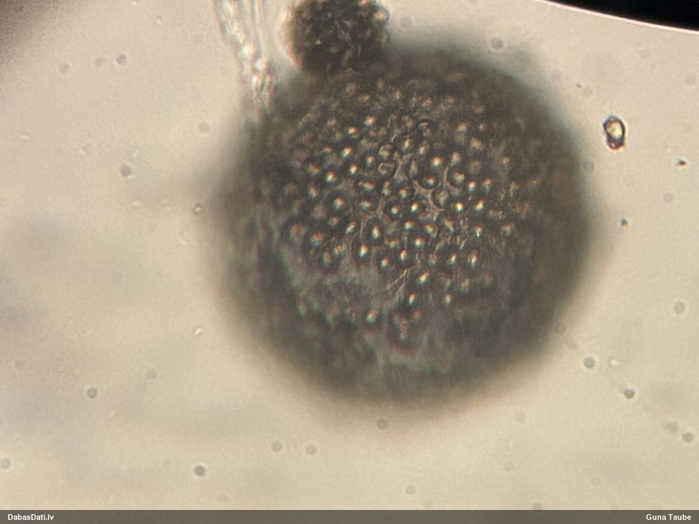 Paldies, Raivo! Ar acu gaišumu man arvien sliktāk, bet mikroskops palīdz. Jā, gribēju teikt, ka paraugam, ja vien nav kāda jutīga atradne, kurai drīkst ievākt tikai mazu gabaliņu, vērts ievākt lielāku gabalu, jo gļotsēnēm patīk kompānija. Un mikroskopa mazajos palielinājumos ar sānu papildus apgaismojumu ir vērts rūpīgi "izstaigāt" visu paraugu. Arī ķērpjus un interesantas sīksēnītes tā var atrast, ko dabā nepamanītu. Ar kriksītēm ir dažādi - pirmās es tā arī tikai citu sugu paraugos pamanīju, bet vēlāk redzēju arī dabā kriskīšu plantācijas - ja to ir daudz, tad var pamanīt jau dabā. Uz sūnām gan ir ekstrēms gadījums, dabā droši nepamanītu, arī eksemplāra noņemšana no sūnas nebija pārāk veiksmīga, tāpēc par noteikšanu mazliet šaubos (sporām mazliet cits tonis). Bet pagaidām citas hipotēzes nav (un konkrētā eksemplāra arī vairs ne).