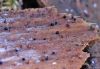 Šis interesants. Uz sausām priedes kritalām rozā mazi līdzīga izskata augļķermeņi maijā aug divām citādi atšķirīgām sugām (dažādās dzimtās) - melnajai plaispikai Amaurochaete atra un trauslajam gļotpūpēdim Reticularia jurana. Pēc sīkām mikropazīmēm (foto nav redzama pat ne sīka balta pakāje ap augļķermeni, un uz virsmas ar lielu piepūli var ja ne saskatīt, tad iztēloties tīklotu virsmas rakstu) izšķīros par biežāko no abām - melno plaispiku, kas tipiski aug samērā atklātās, skrajās vietās, t.sk. nesenos izcirtumos.