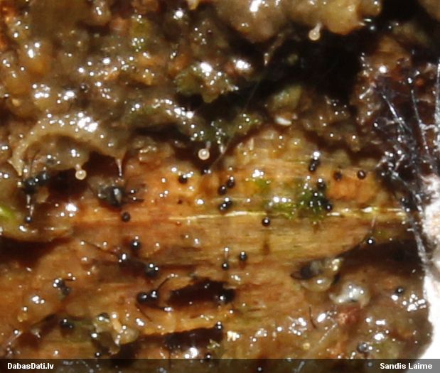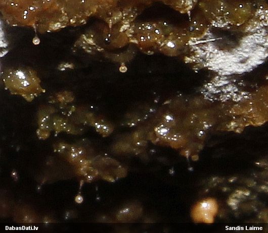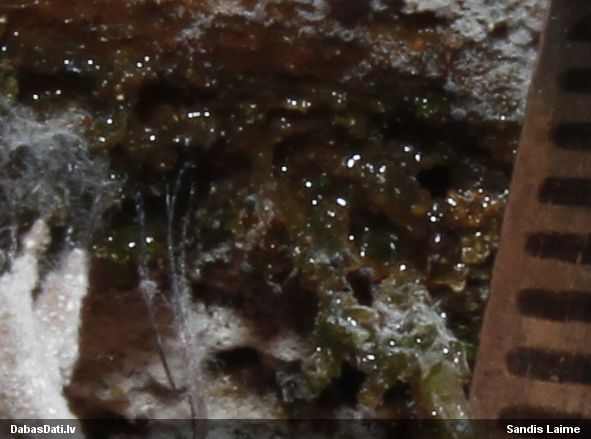 Mazie dzīves prieciņi! :) Lūk, pie kā noved cilvēku iedvesmošana uz gļotsēņošanu, nepieciešamas tikai pareizi iestatītas un sugu redzošas acis. Paraugs tika ķidāts ar pietāti, vēl ir pietiekami daudz materiāla. Atrašanai noteikti jāizmanto 40x lupa ar gaismiņu, bez tās neiztikt. Konkrētā sveķainā egle atšķīrās no visām pārējām, bija noliekusies 45 grādu lenķī, pasargāta no tiešiem nokrišņiem. Īpaša uzmanība jāvelta samtaini melnajam micēlijam, ar ko noklātas senas sveķainas rētas. Ja tiek ieraudzīti gļotsēnes augļķermeņi, tad viss uzreiz kļūst skaidrs. Tie ir pietiekami izteiksmīgi. Novēlu veiksmes visiem, kuri vēlas šo būtni ieraudzīt savām acīm! Vakar pārskatīju arī citas DMB audzes, tomēr bez sekmēm. Tomēr prasības pret dzīvotni nav gluži izšķirošas, Dānijā atrasta arī stādītās mono-audzēs. Jāturpina meklēt retās sugas :)