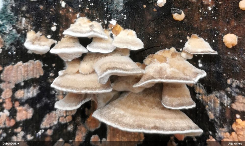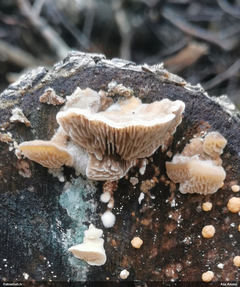 Šim Vijas paraugam iekšas precīzi tādas pašas - baltdzeltenas, ar kapilīciju ar maziem mezgliem, un virsma balta. Sporas gan lielākas: https://dabasdati.lv/lv/observation/b146f03a39b8789e2897007d9e464255/