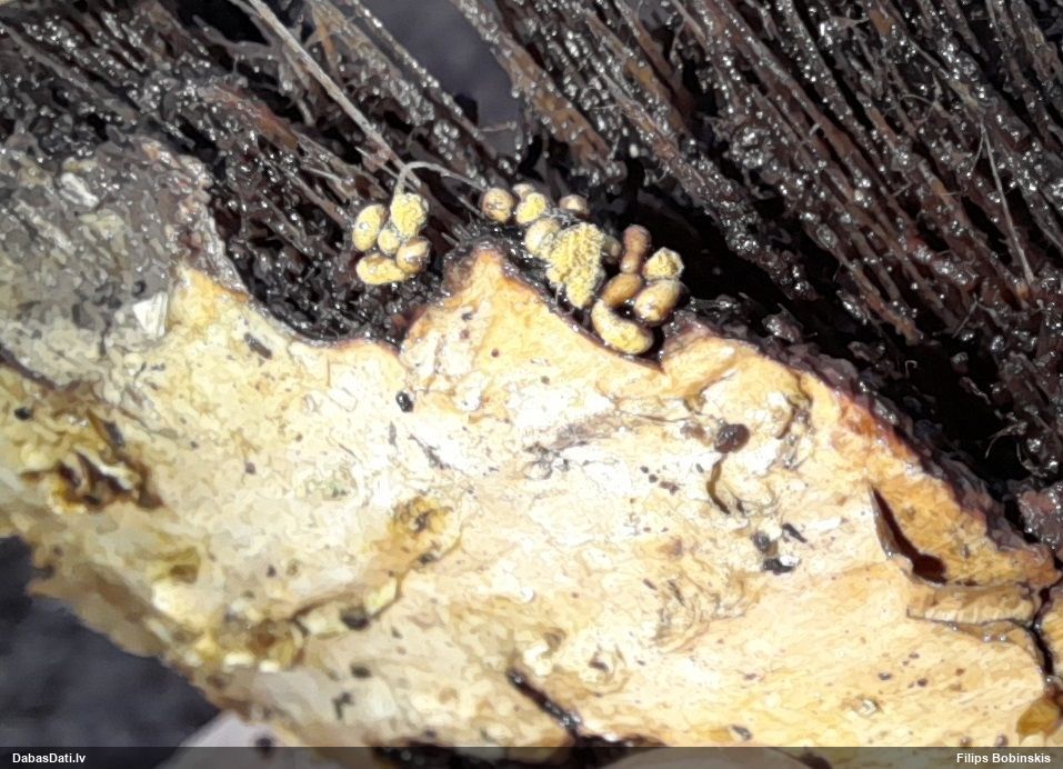 Liels paldies par paraugu! Mikroskopēju, viss kārtībā, kapilīcijs ir un suga pareiza. :) Un kā jau ir gadījies - tikko saņemu un apskatu paraugu, tā uzreiz ekspedīcijā izdodas atrast arī pašai (1 gab. augļķermeni :D). Ir pilnīgi droši, Raivo, bez Tava atraduma es arī nebūtu atradusi, jo uzmanību pievērsu, ka egle bija tieši tāda pati - slīpa un melna, tāpēc īpašs paldies par biotopa un substrāta bildēm! Kad ieraudzīju koka atbilstību, tad meklēju, kamēr atradu. :)