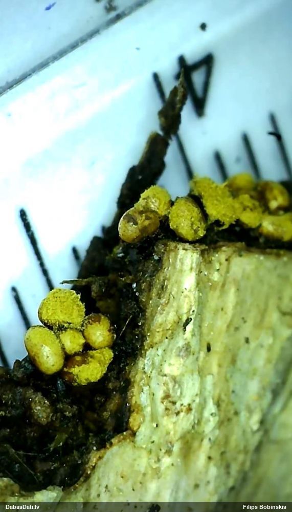 Man pēkšņi radās ideja - vai tur bija nu ļoti mitrs mikroklimats, egle ar melnalksni? Hipotētiski tādas dzeltenas var būt Diachea muscorum. Te bilde ir mazliet līdzīga: https://fr.wikipedia.org/wiki/Fichier:Craterium_muscorum,_Trawscoed,_North_Wales,_Aug_2016_-_Flickr_-_janetgraham84.jpg