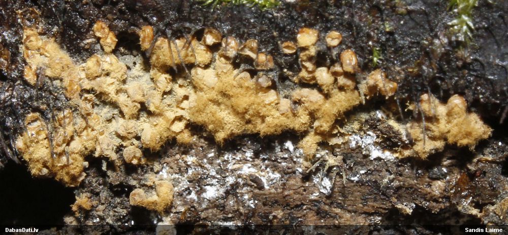 Skatoties uz nelīdzeno virsmu, var būt grubuļainais Fuligo luteonitens, bet droši to varētu pateikt mikroskopijā pēc sporām