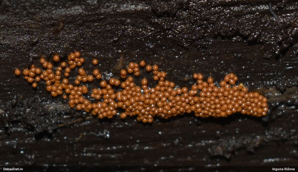 Šobrīd varu iedomāties 2 variantus - melnā plaispika Amaurochaete atra vai parastais gļotpūpēdis Reticularia lycoperdon. Pēc izmēra, augšanas laika un augšanas uz apstrādāta koka atbilst abas.