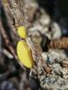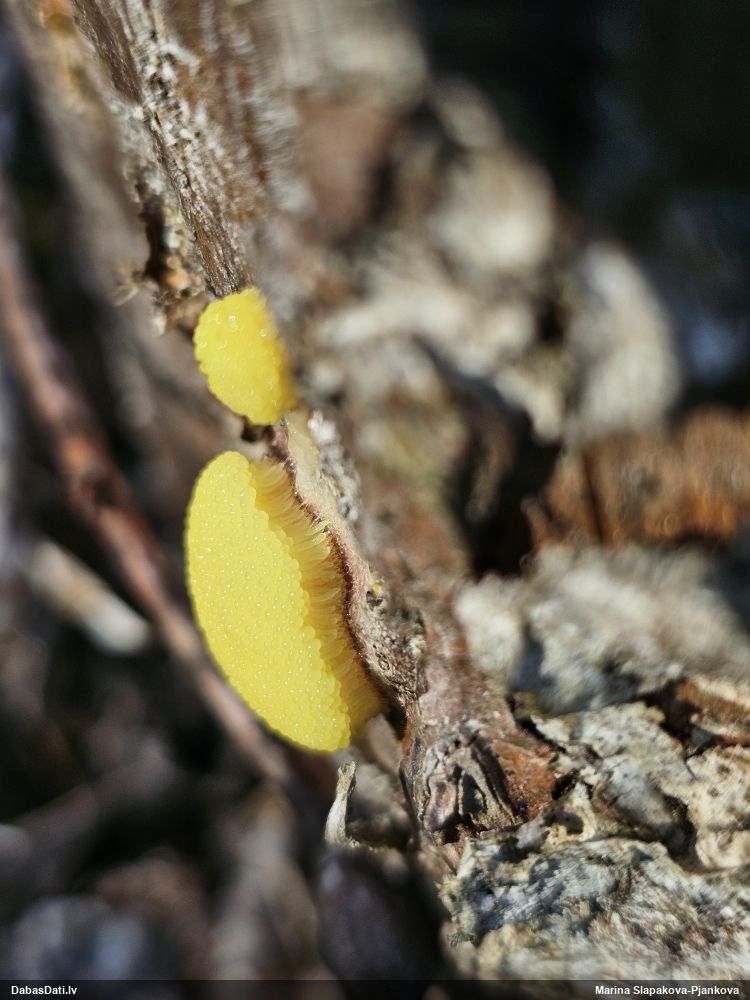 Man pēkšņi radās ideja - vai tur bija nu ļoti mitrs mikroklimats, egle ar melnalksni? Hipotētiski tādas dzeltenas var būt Diachea muscorum. Te bilde ir mazliet līdzīga: https://fr.wikipedia.org/wiki/Fichier:Craterium_muscorum,_Trawscoed,_North_Wales,_Aug_2016_-_Flickr_-_janetgraham84.jpg