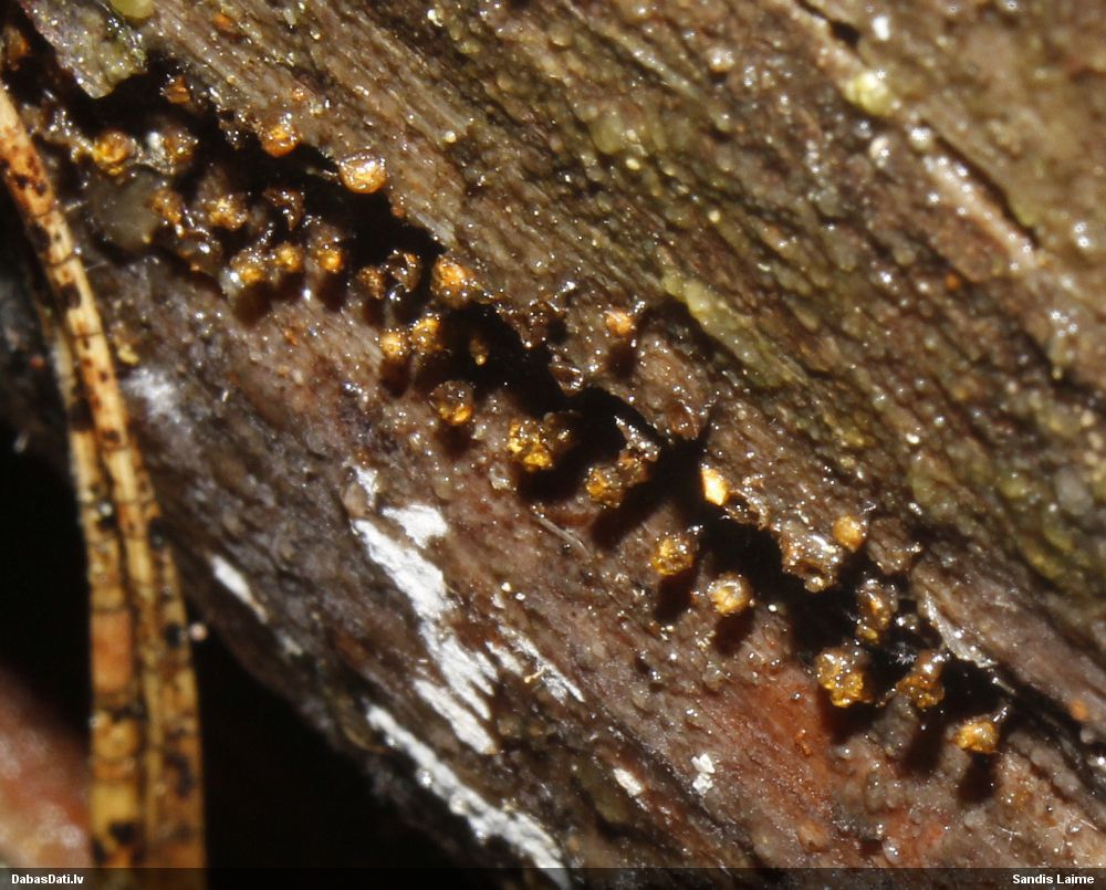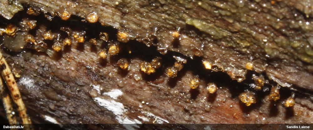 Domāju to Sorocybe resinae, ja tā, tad esmu soli tuvāk mērķim, nu zinu, kā izskatās un kur meklēt. Gļotsēnītes klāt gan nebija.