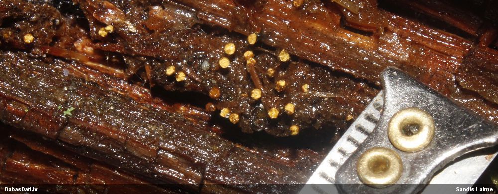 Julitas, šai paņemts paraugs, diezgan izsporojies. Un tai otrai līdzīgajai, kam ieziņots novērojums, arī. Pārliecinājos, ka tiešām egles kritalas. Bet tādu gļotsēņu diezgan daudz, vai uz katras egles kritalas, daudzās vietās stumbram, tagad dzeltenos sporu mākoņus labi redz.