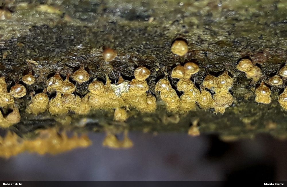 Vai tik nebūs medainā bumbulīte? Augļķermeņi vertikāli izstiepti, sporu mākonis ciešā klājienā.