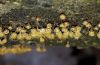 Man pēkšņi radās ideja - vai tur bija nu ļoti mitrs mikroklimats, egle ar melnalksni? Hipotētiski tādas dzeltenas var būt Diachea muscorum. Te bilde ir mazliet līdzīga: https://fr.wikipedia.org/wiki/Fichier:Craterium_muscorum,_Trawscoed,_North_Wales,_Aug_2016_-_Flickr_-_janetgraham84.jpg