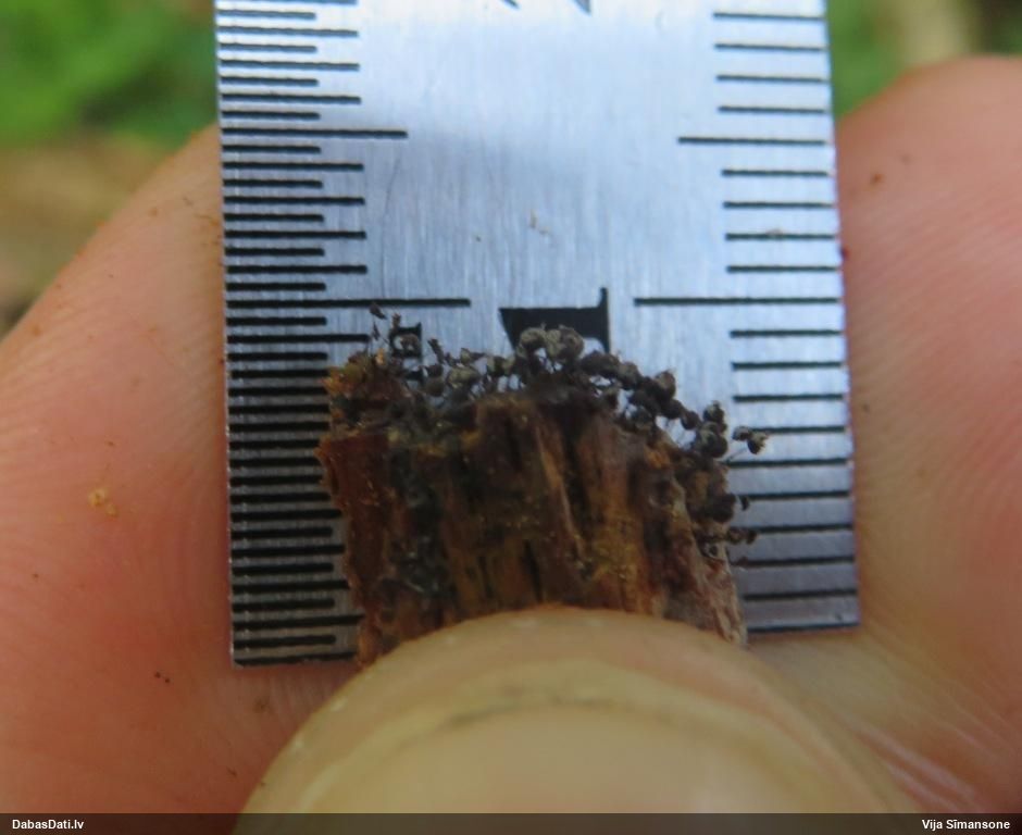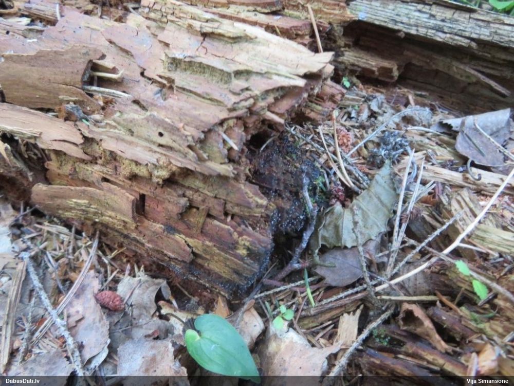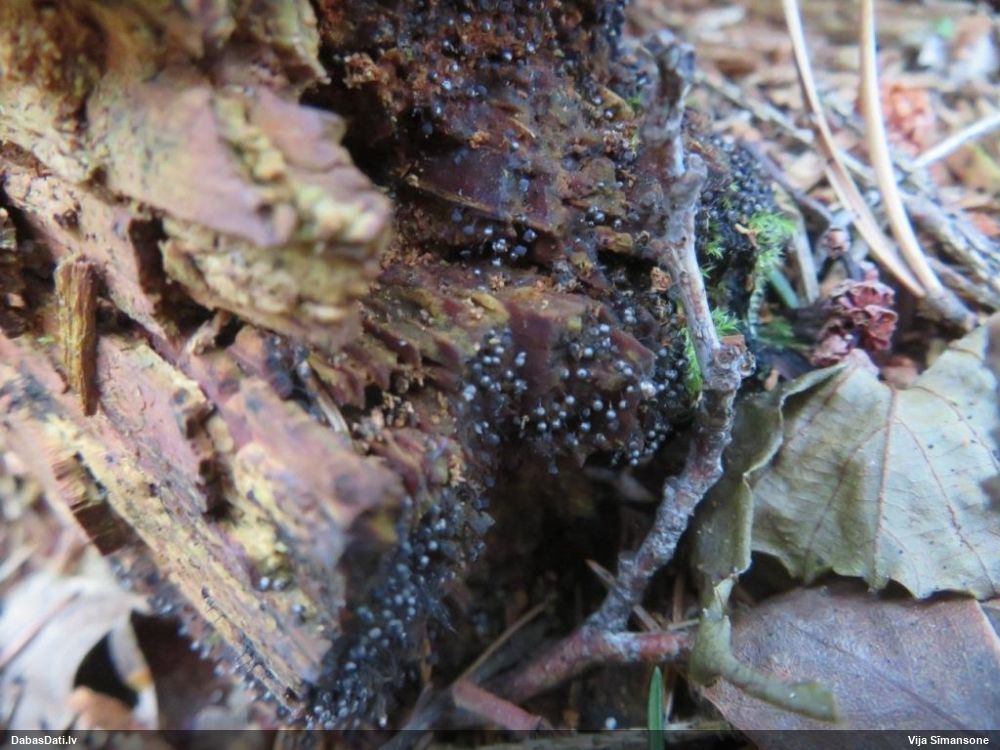 Šis interesants. Uz sausām priedes kritalām rozā mazi līdzīga izskata augļķermeņi maijā aug divām citādi atšķirīgām sugām (dažādās dzimtās) - melnajai plaispikai Amaurochaete atra un trauslajam gļotpūpēdim Reticularia jurana. Pēc sīkām mikropazīmēm (foto nav redzama pat ne sīka balta pakāje ap augļķermeni, un uz virsmas ar lielu piepūli var ja ne saskatīt, tad iztēloties tīklotu virsmas rakstu) izšķīros par biežāko no abām - melno plaispiku, kas tipiski aug samērā atklātās, skrajās vietās, t.sk. nesenos izcirtumos.