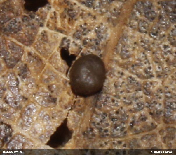 Nevar saprast, uz kā auga - vai tas ir nobirās, vai uz kritalas mizas? Abas hipotēzes ir "pa tēmu", bet man "nepatīk" kopskats, kur skaidri redzams, ka vairāki augļķermeņi ir cieši kopā, bet tas nav raksturīgs ne vienai, ne otrai hipotēzei, kur augļķermeņi tipiski ir nodalīti. Ļoti interesanti, ja ir paraugs, tad kāds tas izskatās tagad, un vispār to vajadzētu mikroskopēt.